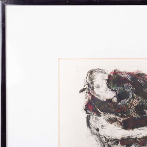 Marlies van Berkel, Geen titel, jaartal onbekend. Monotype in zwarte kunststof lijst. Abstracte compositie in zwart, rood, blauw en groen. Conditie: goed met gebruikssporen aan de lijst. Afmetingen: werk 20 x 30; lijst 40,5 x 50,5 cm.