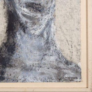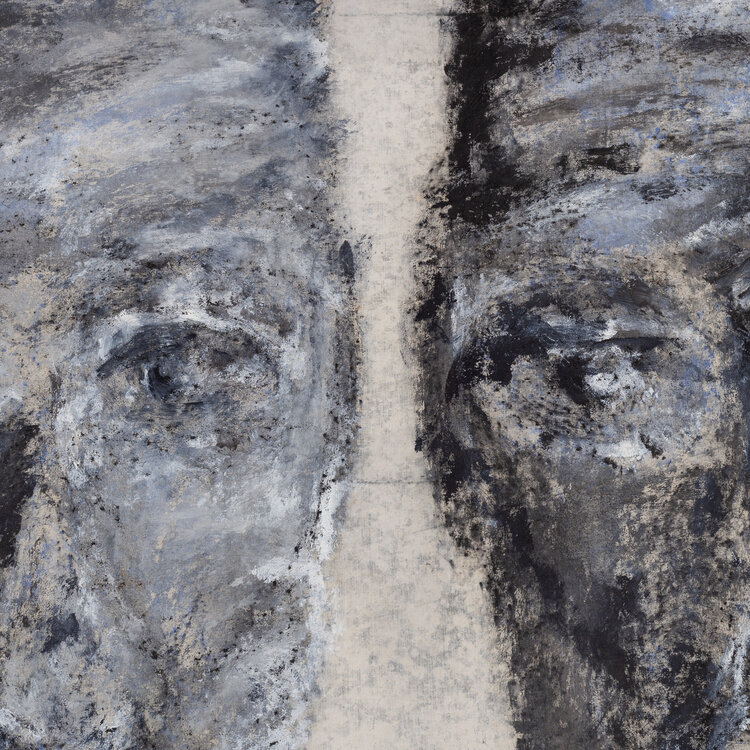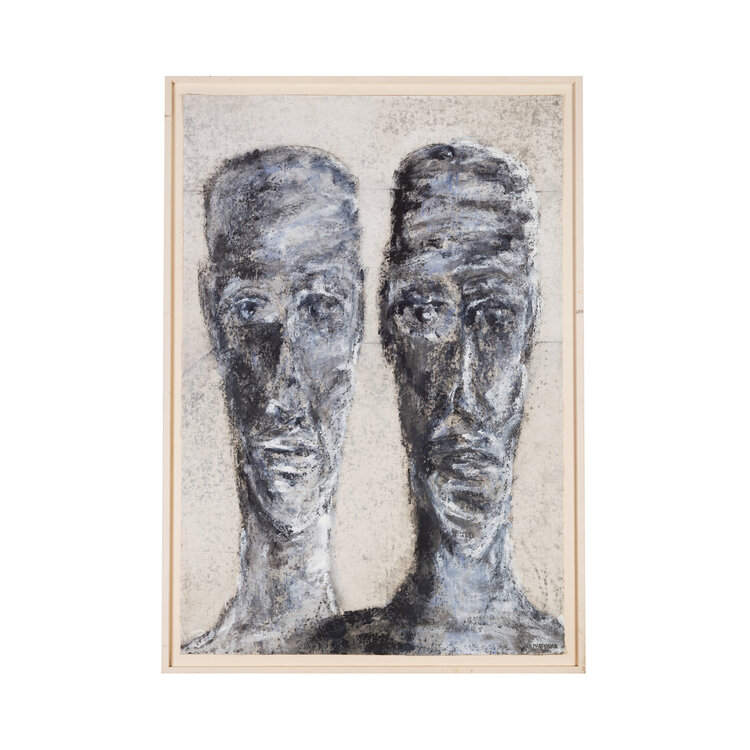Mart Visser, 'De tweeling', 2017. Mixed media op papier in blank houten lijst. Afbeelding van twee hoofden in zwart, wit en grijstinten. Signatuur en datering rechtsonder. Conditie: lijst vertoont gebruikssporen. Afmetingen werk: 170 x 122 cm.