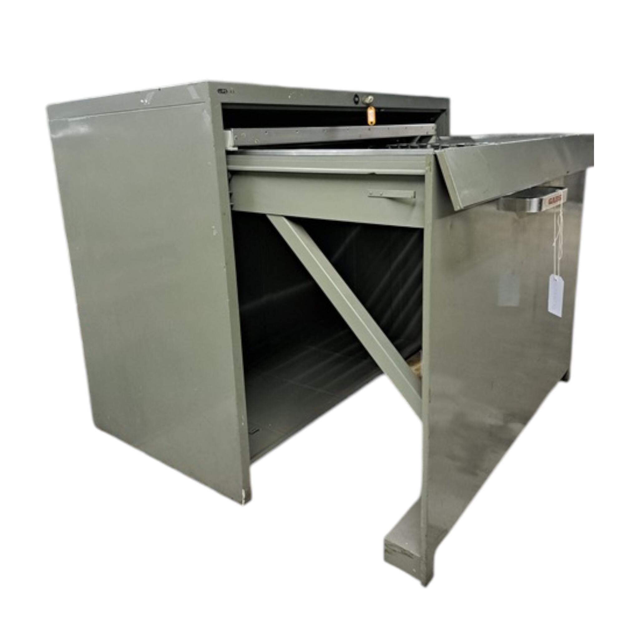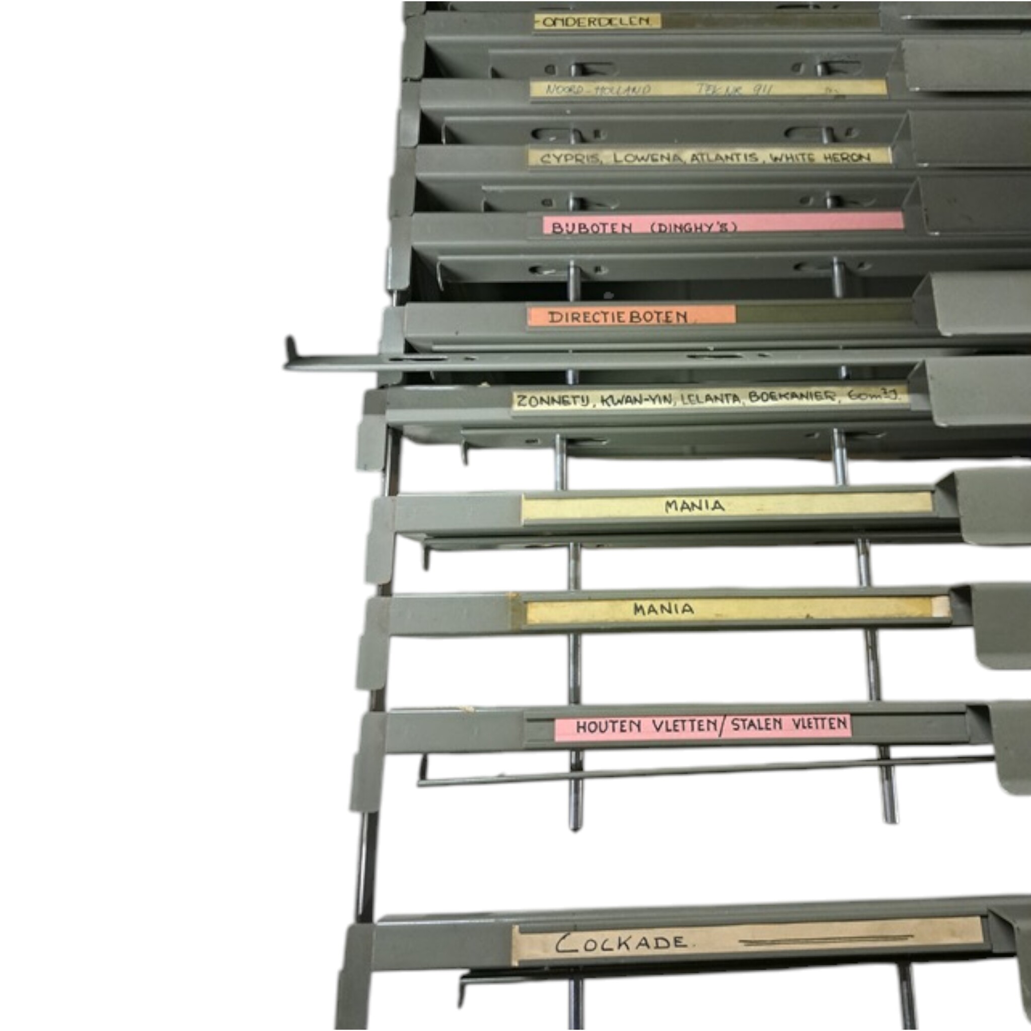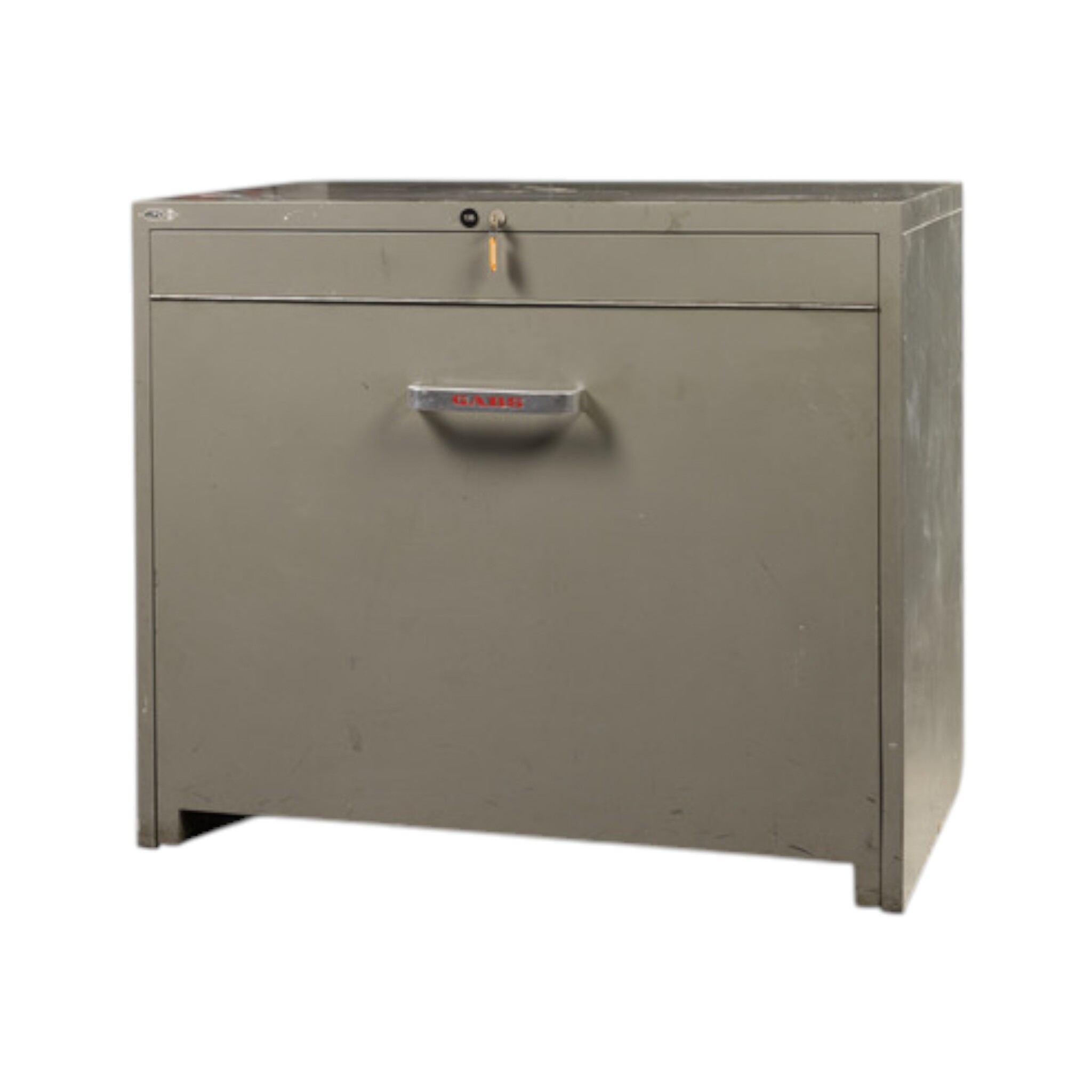 Metalen archiefkast met uitschuifbaar binnenwerk, waarin technische tekeningen hangend werden opgeborgen (zgn. GABS-kast). De kast is afkomstig van de Amsterdamsche Scheepswerf G. de Vries Lentsch. Datering: ca. 1950-1960. De voorzijde van de kast bestaat uit twee delen, een met een sleutel afsluitbaar klein bovendeel dat scharnierend naar beneden klapt, en het deel daaronder met handgreep. Samen vormen ze de voorkant voorzien van een lade-achtig uitschuifbaar binnenwerk. In dat frame hangen veertien metalen latten met label. Daarbij een eveneens losliggend onderdeel dat bestaat uit een soorgelijke lat maar dan met scharnierend zijdeel. Alle latten zijn voorzien van metalen pennen. Aan de linkerkant is op de voorzijde een schildje met merknaam aangebracht. Op de handgreep een ingeslagen en met rood ingevulde merknaam. Links naast het sleutelgat is een plastic rondje geplakt met in wit een cijfer. Aan de sleutel hangt een oranje plastic label met daarin een wit papiertje met tekst. Conditie: vertoont gebruikssporen. Afmetingen: H: 105 cm B: 122,4 cm D: 77,6 cm.