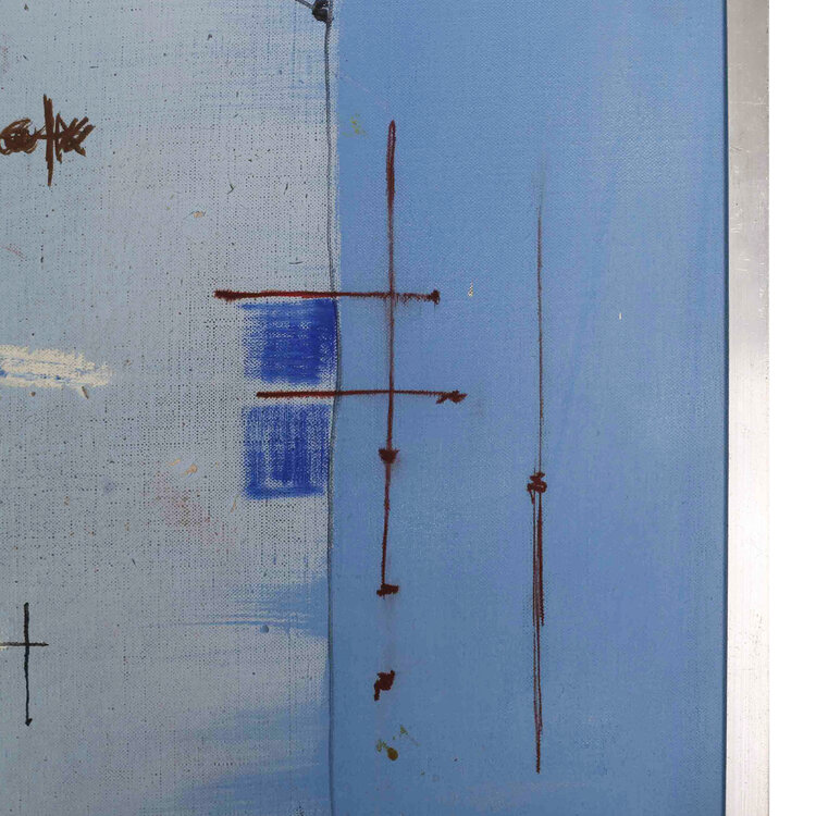 M.H. Sjardijn, Het gerecht, jaartal onbekend. Olieverf op doek met zilverkleurige lijst. Geabstraheerde voorstelling met vrouwelijk naakt en kleurrijk geometrische vormen en lijnen. Afmetingen: 102 x 91 cm. Conditie: Lijst toont sporen van gebruik.