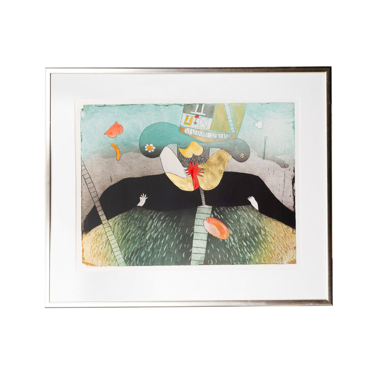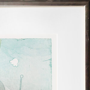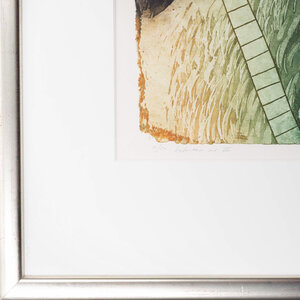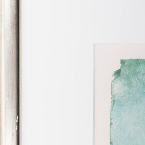 Michel van Overbeeke, 'Between us III', 1996. Kleurenets in zilverkleurige lijst, oplage, 11/50. Abstracte kleurrijke voorstelling met kleurvlakken in blauw, groen, zwart en bladgoud. Linksonder oplagenummer en titel, rechtsonder signatuur en jaar. Michel van Overbeeke (geb. 1942) is een Nederlandse kunstenaar die werkt in glaskunst, grafiek, keramiek en schilderkunst. Hij genoot zijn opleiding aan de Amsterdamsche Grafische School. Zijn vroege werk bestaat voornamelijk uit grafiek, tekeningen en schilderijen. Later breidde hij zijn kunde uit door monumentale kunstwerken in opdracht te vervaardigen in verschillende materialen. Onder andere het glas-in-loodraam in de Sint-Bavokerk te Haarlem en de kroonluchters in Paviljoen Welgelegen zijn van zijn hand. Van Overbeeke heeft geëxposeerd in onder andere het Frans Hals Museum, het Stedelijk Museum Zwolle en het Stedelijk Museum Kampen. Conditie: goed, lijst toont wat gebruikssporen. Afmeting: 73 x 87 cm.