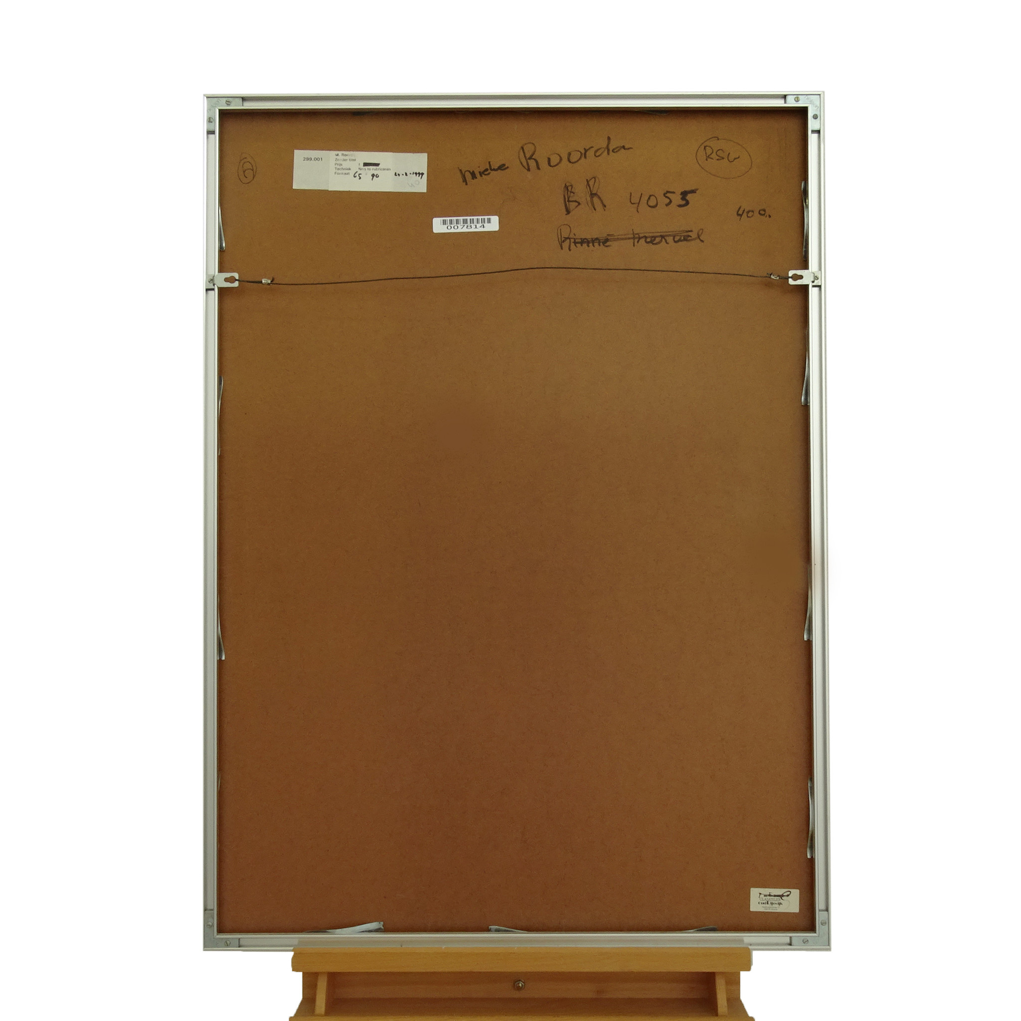 Mieke Roorda, zonder titel, 1988. Lino met metalen lijst, oplage 38/40. Abstracte voorstelling met rood en groen raster op gele achtergrond. Afmetingen: beeldvlak 59 x 42 cm Conditie: Het werk is in goede conditie maar de lijst toont sporen van gebruik.