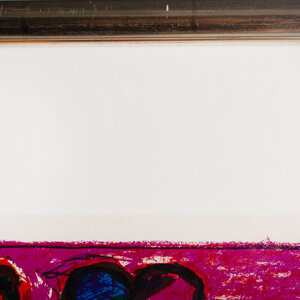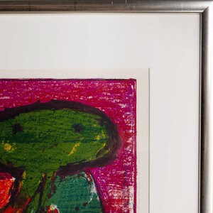 Mogens Balle, 'Compositie', jaartal onbekend. Kleurenlitho in zilverkleurige lijst, oplage E.A.. Kleurrijke abstracte compositie van fantasiefiguren in paars, blauw, rood, groen en geel. Signatuur rechtsonder. De Deense kunstenaar Mogens Balle (1921-1988) was als schilder en schrijver aangesloten bij de Cobra-beweging. In zijn werk speelden fantasiefiguren de hoofdrol. Vanaf de jaren 60 maakte hij ook bronzen beelden van zijn fantasiefiguren. Conditie: goed. Afmetingen lijst: 69 x 85 cm.