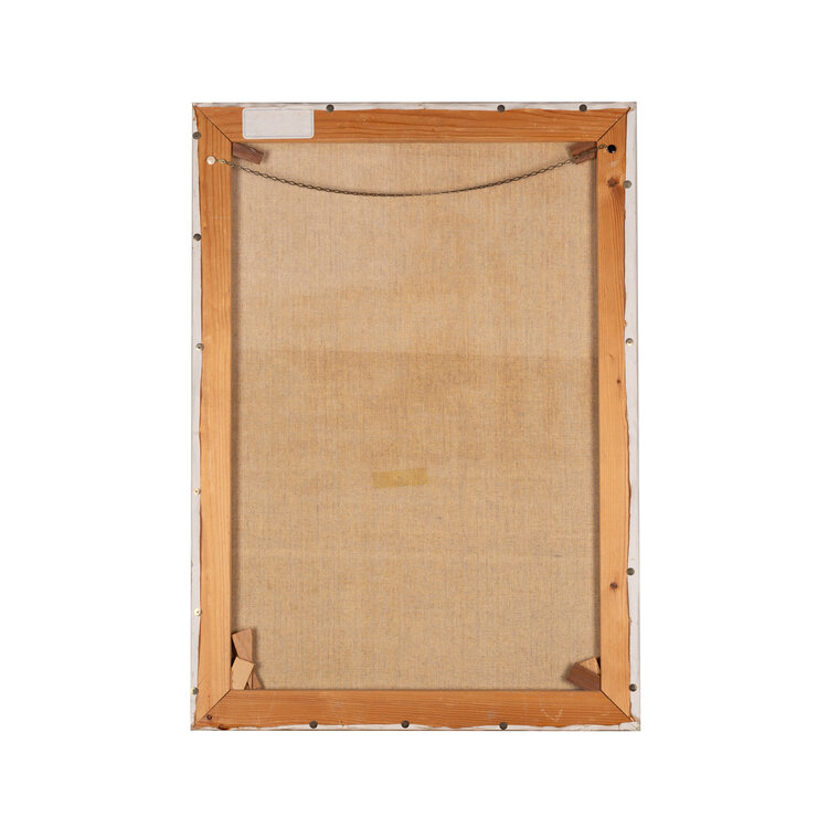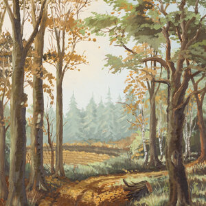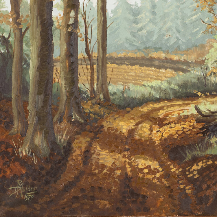 Mulder, zonder titel, 1979. Verf op doek op spieraam. Afbeelding van een boslandschap in groen- en bruintinten. Signatuur en datum linksonder. Conditie: in het midden is het doek beschadigd. Afmetingen: ca. 70 x 50 x 1,5 cm.