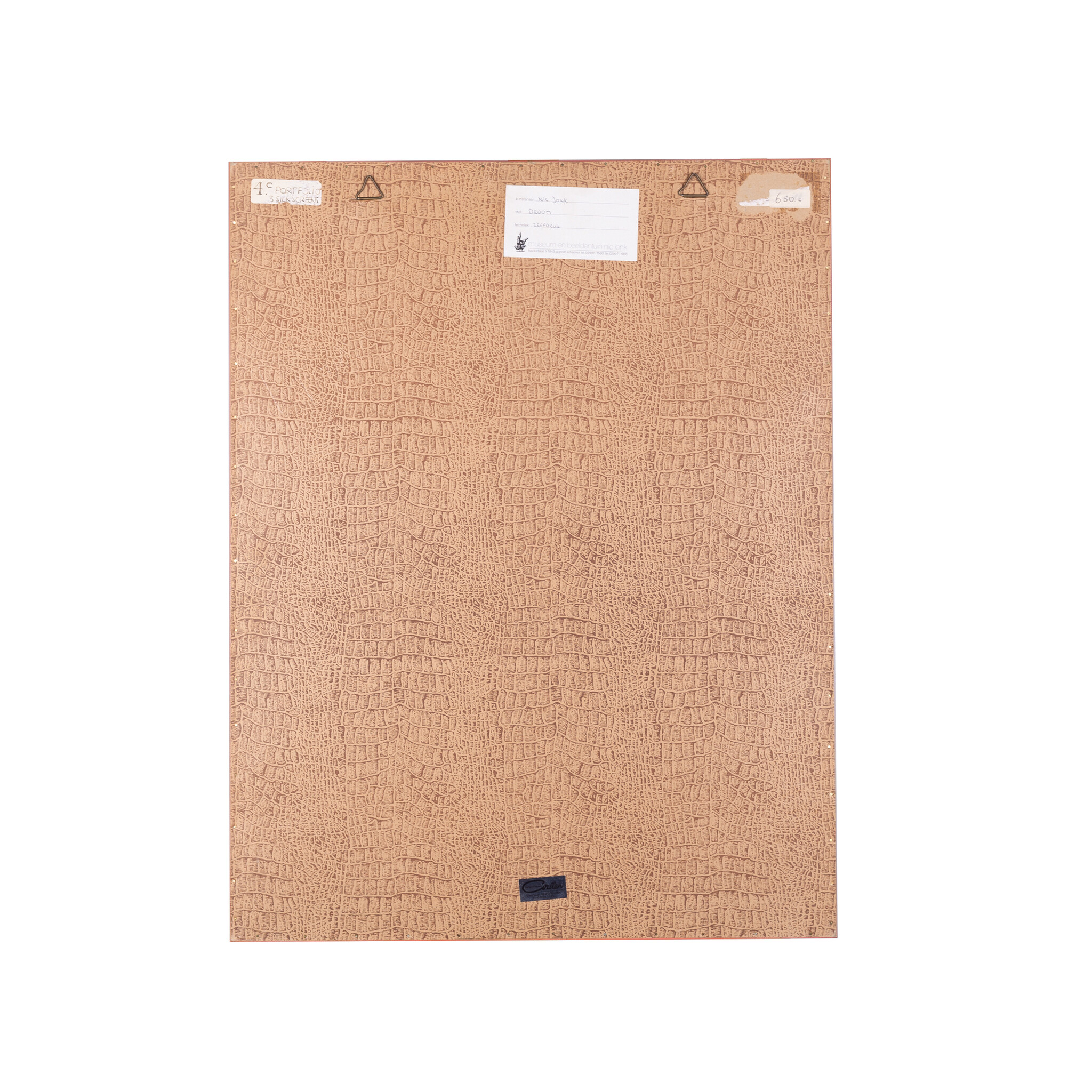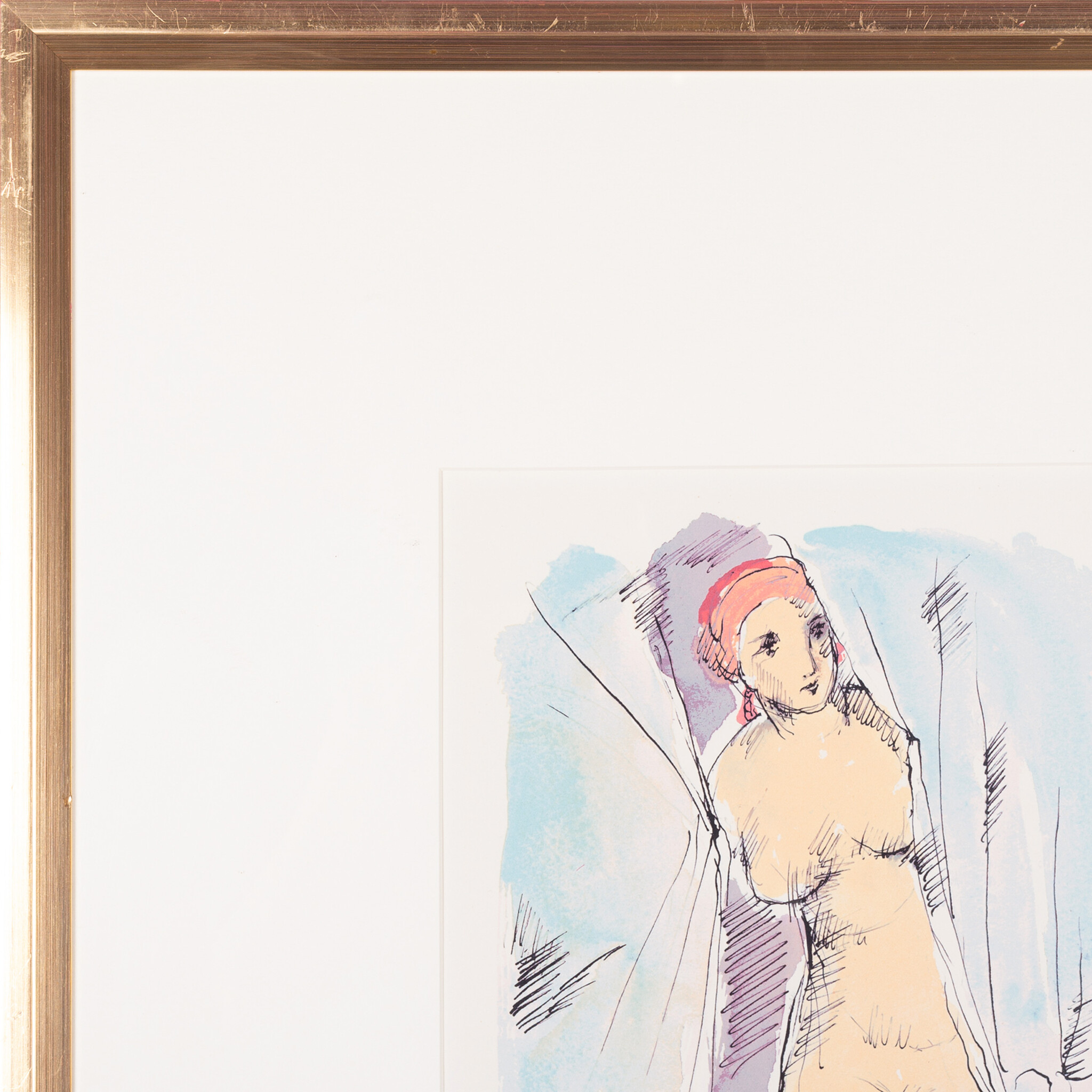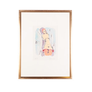 Nic Jonk, 'Droom', 1981. Zeefdruk op papier in goudkleurige lijst, oplage 66/150. Portret van een naakte vrouw met roze kousen die blauwe gordijnen opent. Signatuur rechtsonder. Conditie: werk is in goede conditie, lijst toont lichte gebruikssporen. Afmetingen passe-partout: 26 x 38 cm; lijst: 75 x 58 cm.