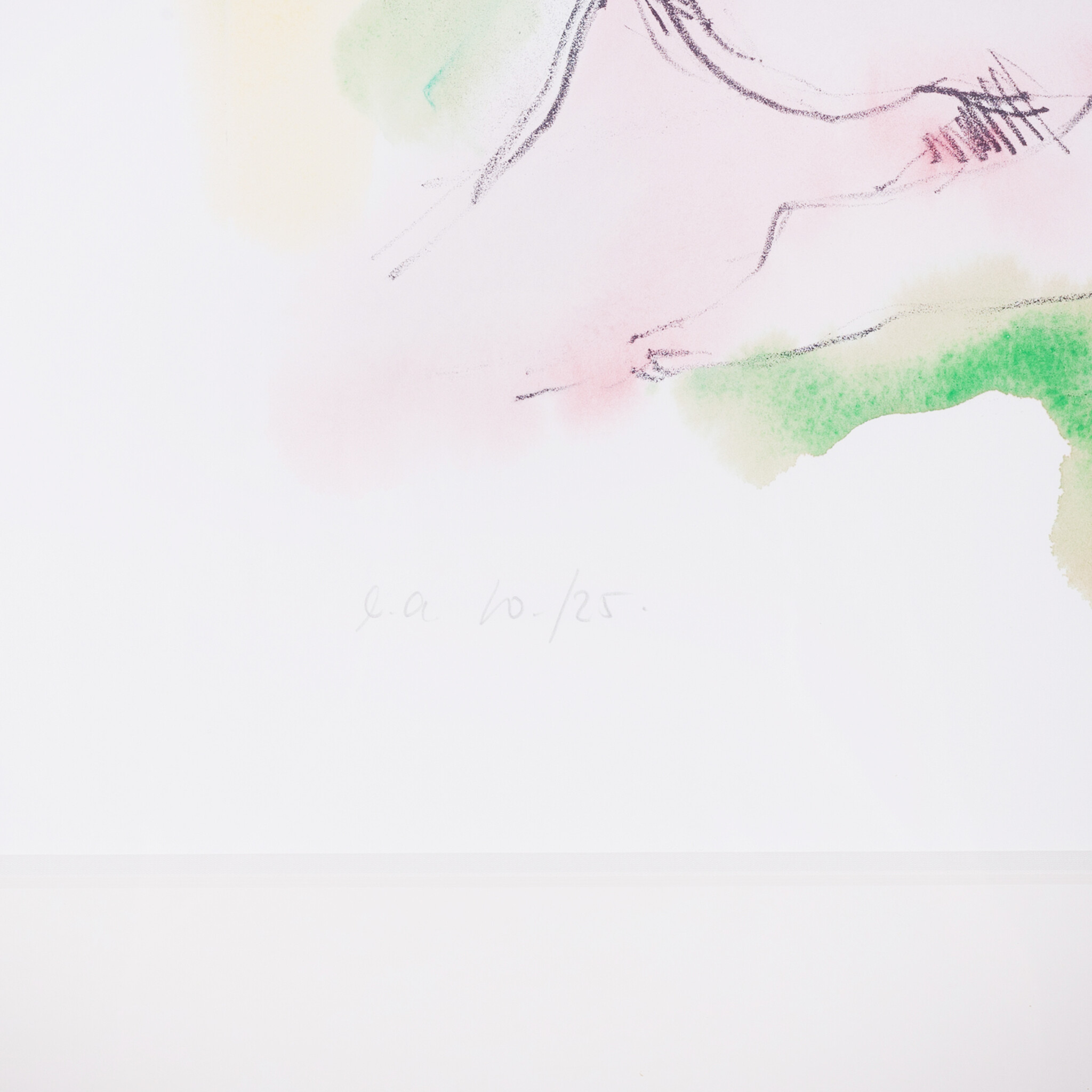 Nic Jonk, 'Op de sofa', 1990. Met de hand ingekleurde litho in goudkleurige houten lijst, oplage e.a. 10/25. Kleurrijke voorstelling met een liggende naakte vrouw tussen rode bloemen. Signatuur rechtsonder. Conditie: goed, met lichte gebruikssporen aan de lijst. Afmetingen passe-partout: 44 x 60 cm; lijst: 67 x 91 cm.