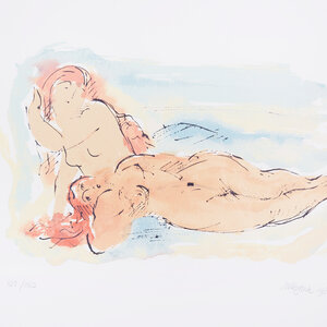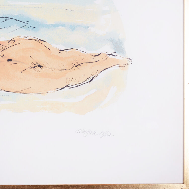 Nic Jonk, 'Vrouwelijk naakt', 1980. Zeefdruk op papier in goudkleurige lijst, oplage 102/150. Portret van twee naakte vrouwen, de een liggend en de ander zittend. Signatuur rechtsonder. De zeefdruk is afkomstig uit een map met vier zeefdrukken die gemaakt is ter gelegenheid van 15 jaar Beeldentuin Nic Jonk. Het is in 10 kleuren gedruk en uitgegeven door de Nereïden Grootschermer. Conditie: werk is in goede conditie, lijst toont lichte gebruikssporen. Afmetingen beeldvlak: 30 x 48 cm; lijst: 50 x 66 cm.