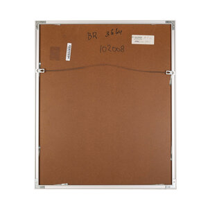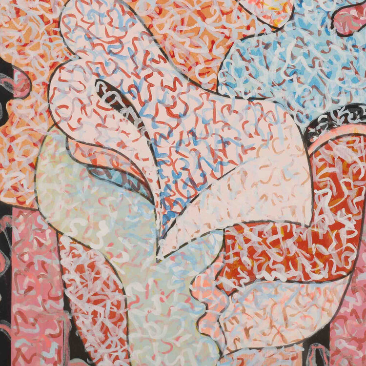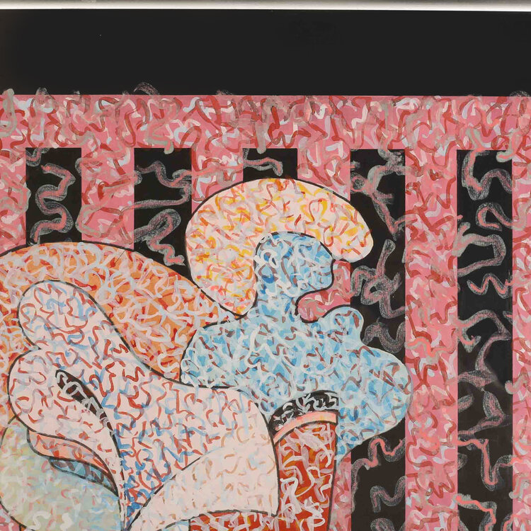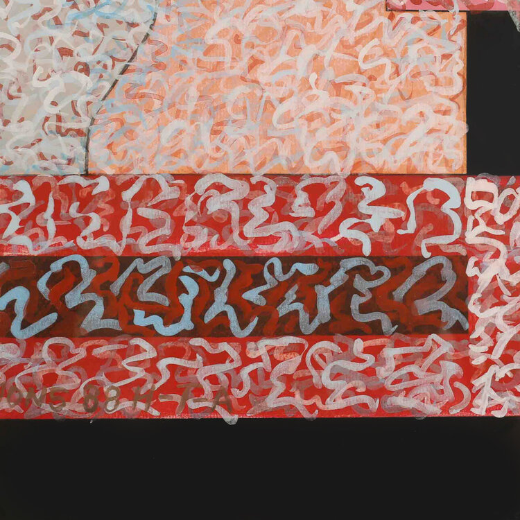 Nico Emons, H-T-A, 1988. Acryl op papier in metalen lijst. Abstracte afbeelding van een figuur voor voor een achtergrond van rechthoekige vormen met krul accenten. Conditie: goed, gebruikssporen aan lijst. Afmeting lijst: 66 x 55 cm.