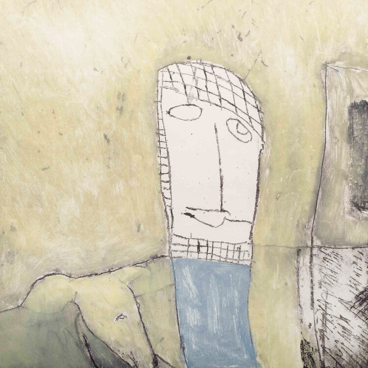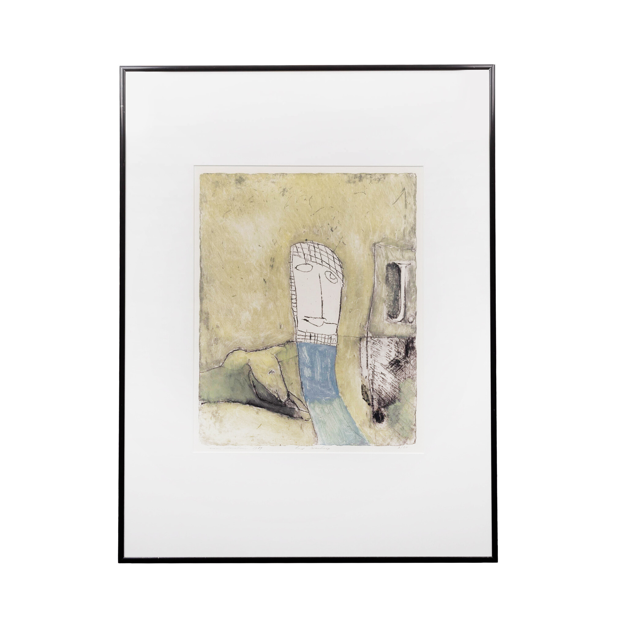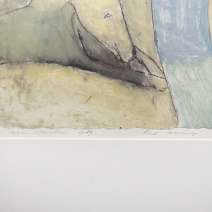 Noor Sternheim (Amsterdam, 1943), 'Lord wanhoop', 1989. Ets in zwarte lijst, oplage 3/20. Figuur in wit en blauw met ernaast een hond in groen-tinten. Signatuur linksonder. Conditie: goed met enkel lichte gebruikssporen aan de lijst. Afmetingen lijst: 65,5 x 51 cm; beeldvlak: 35,5 x 29 cm.