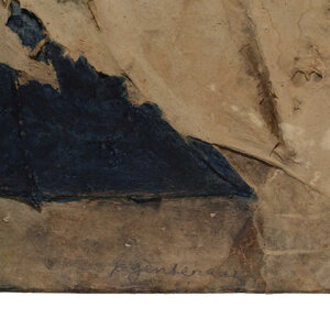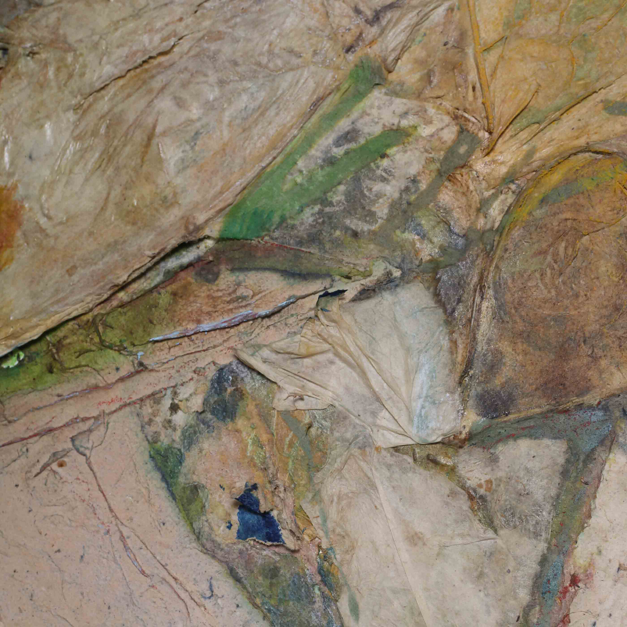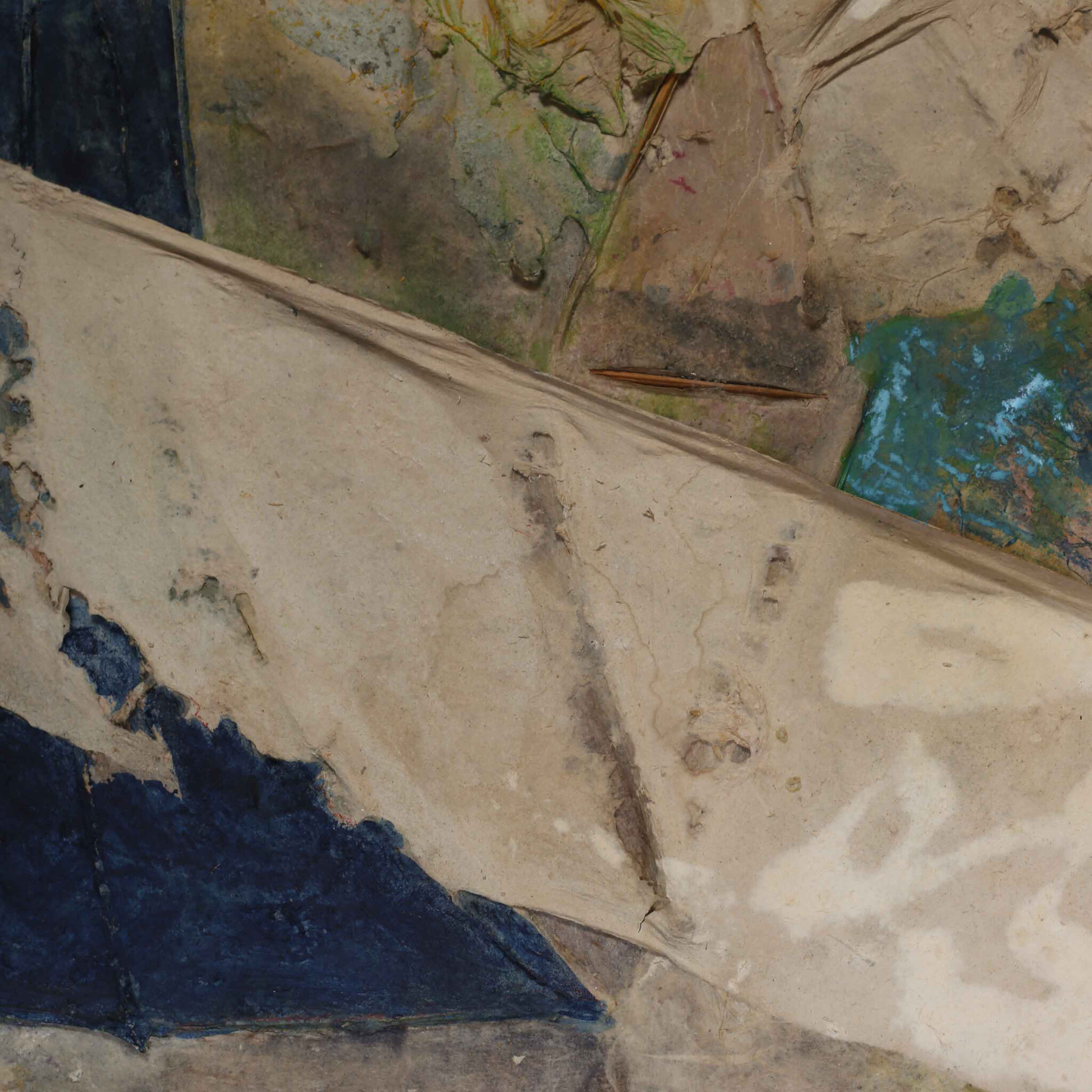 P. Gentenaar, Papieren vlucht, jaartal onbekend. Papier schilderij op paneel. Abstracte compositie in blauw, geel, groen en rood. Conditie: gebruikssporen en aan de randen en hoeken wat beschadiging van loshangend papier. Afmeting lijst: 104 x 112 cm.