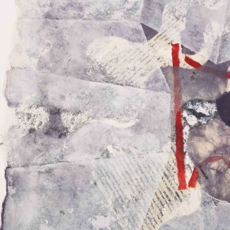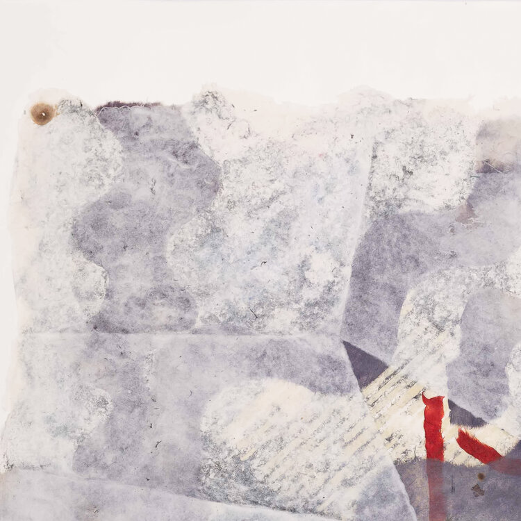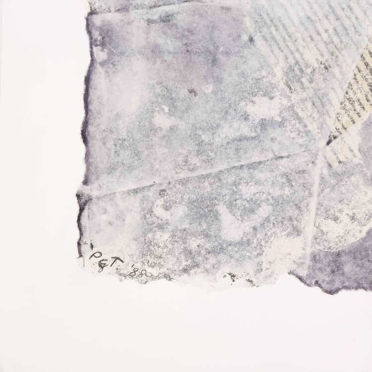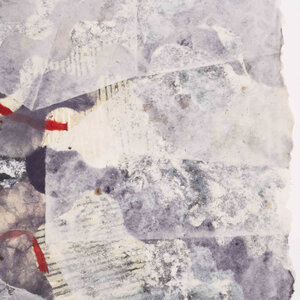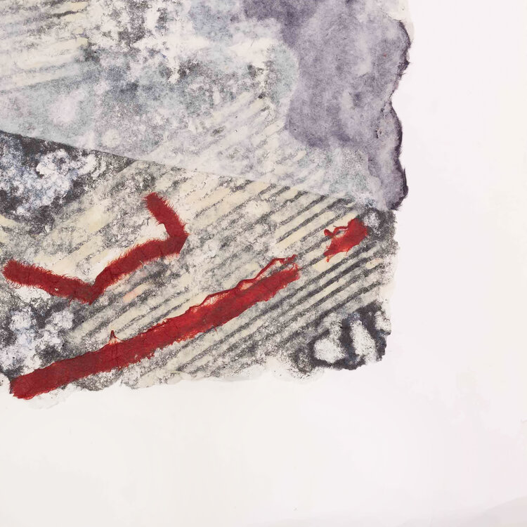P. Gentenaar-Torley, 'Curtained dream', 1988. Papierschilderij geplakt op een vel papier in witte lijst. Abstract werk van handgeschept papier in zwart en wit, met rode lijnen. Signatuur linksonder. Conditie: het werk zit op een paar plekken vast aan het vel papier. Het werk toont gebruikssporen, het ondervel heeft vlekjes en vouwen. Afmeting lijst: 83,5 x 83,5 x 3,5 cm.