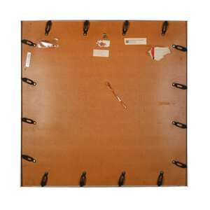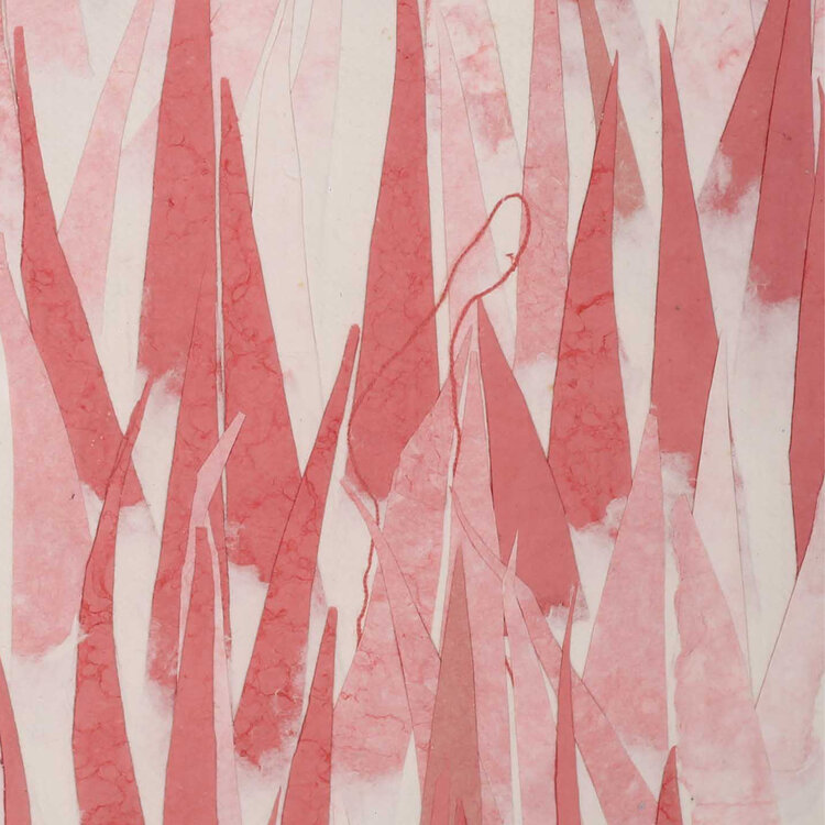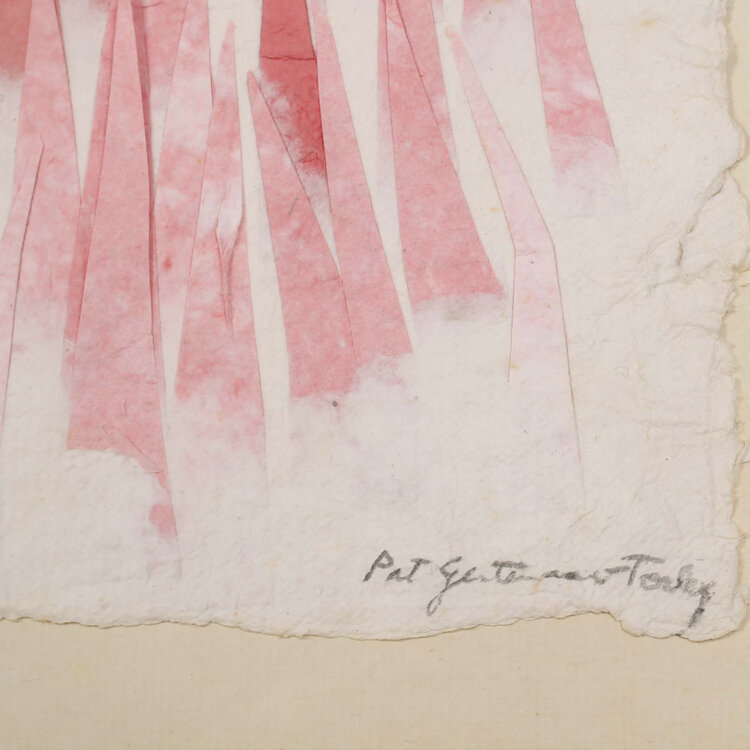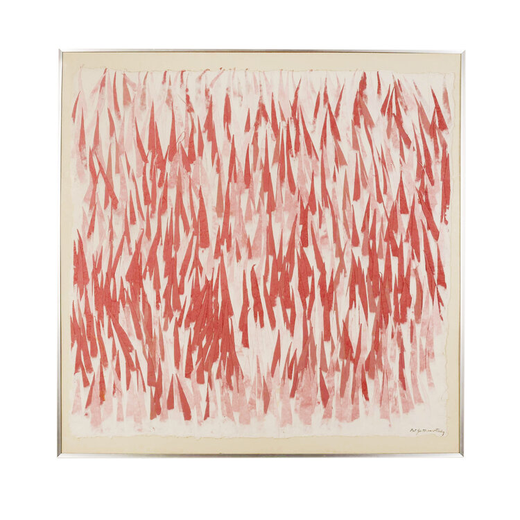 P. Gentenaar-Torley, 'Red Grass', jaartal onbekend. Papierpulp schilderij in metalen lijst. Rode en roze puntige vormen voor een witte achtergrond. Signatuur rechtsonder. Conditie: goed, lichte gebruikssporen op de lijst. Afmetingen: 80 x 80 cm.