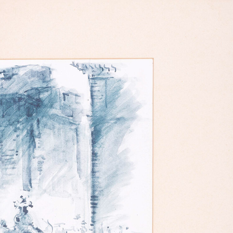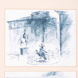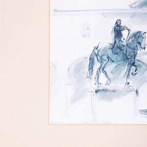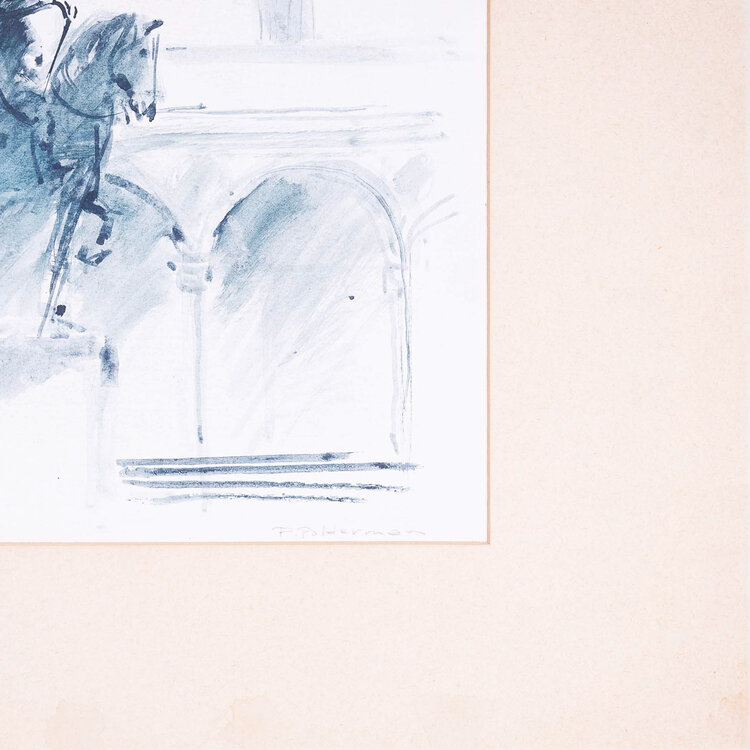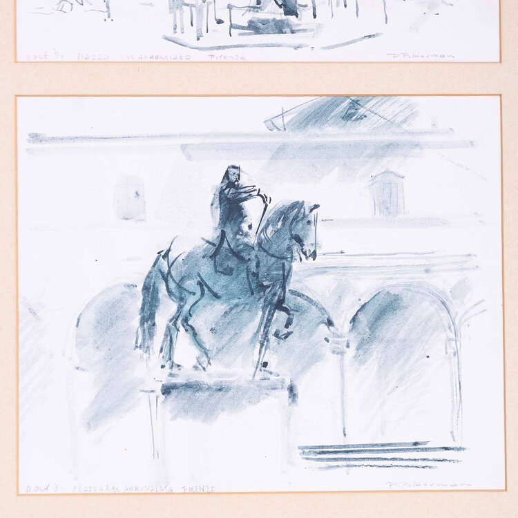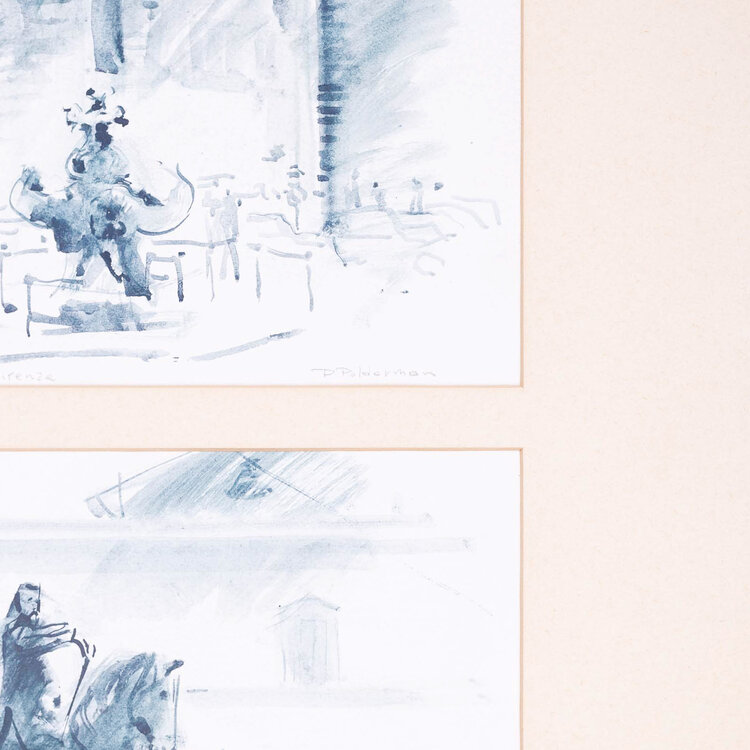 P. Polderman, Piazza Della SS Annunziata Firenze, 1980. Techniek: tempera. Twee afbeeldingen onder elkaar in een passe-partout van een ruiterstandbeeld op een plein in Florence, geschilderd in blauwtinten. Rechtsonder signatuur. Conditie: passe-partout en papier tonen ernstige verkleuring, vlekken op het passe-partout. Afmeting passe-partout: 69 x 50 cm.