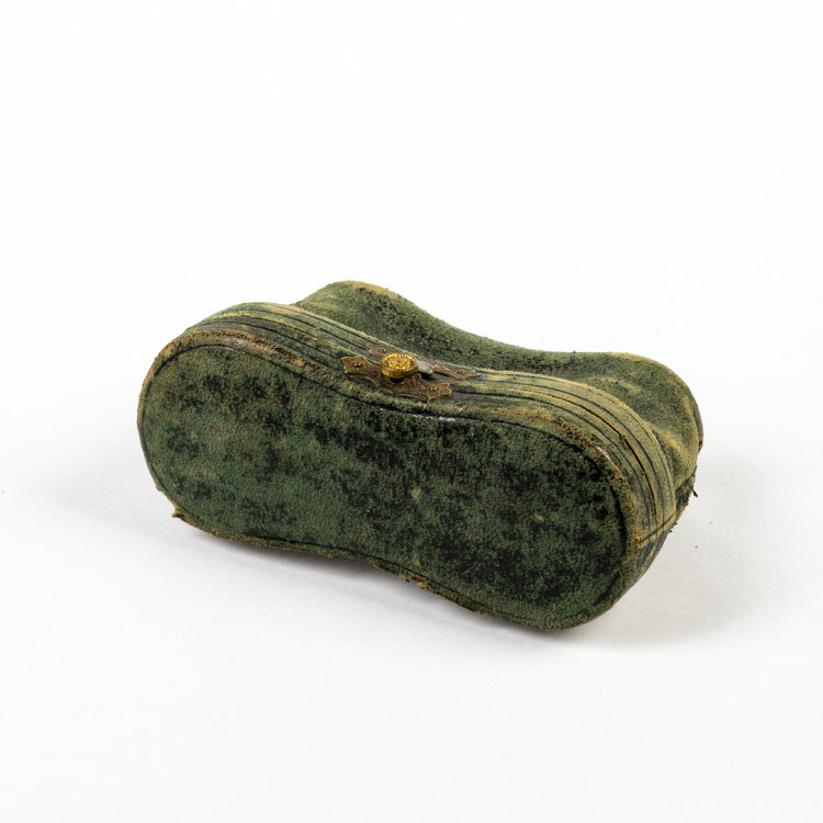 Parelmoer toneelkijker in doosje, omstreeks 1900. Geelkoper, parelmoer en leer, doosje 5 x 10.7 x 4.5, toneelkijker 4.7 x 8.9 x 3 cm. Toneelkijker gemerkt 'Carpentier Ft Paris' op de kijkgaten. Aan de zijkant zit een ringetje waar men een hangsel aan kan bevestigen, om de toneelkijker aan de pols te kunnen laten hangen bijvoorbeeld. De kijker zit in een verstevigd doosje met geelkoperen sluiting en blauwe voering van zijde-achtige stof. De buitenzijde is groen, maar lijkt donkerder te zijn geweest. Het doosje is waarschijnlijk niet het originele doosje bij de toneelkijker; de afdrukken van kijkgaten in het doosje komen niet overeen met de huidige toneelkijker. Conditie: goed tot matig, de toneelkijker is in goede staat met lichte gebruikssporen en tekenen van ouderdom zoals slijtage aan het geelkoper en een beetje vuil in de glazen. Het doosje is veel gebruikt waardoor het leer is versleten. Op sommige plekken is de stof licht beschadigd door uitvoerig gebruik en ouderdom.