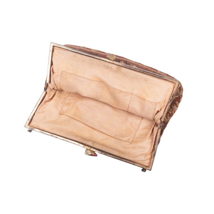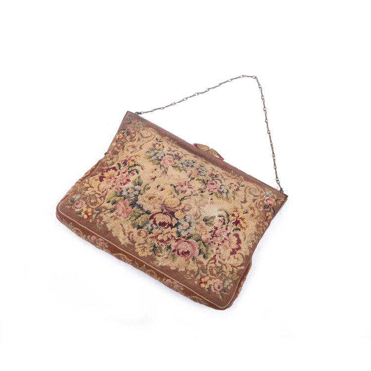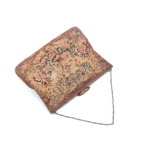 Petit point avondtas, eerste helft 20ste eeuw. De geborduurde avondtas met bloemmotief in petit point steek heeft een crèmekleurige binnenvoering met opbergvakjes, een decoratieve sluiting met rode accenten en een metalen draagketting. Conditie: de tas vertoont lichte sporen van gebruik. Afmetingen: zonder hengsel 14 x 18 x 2 cm; hoogte met hengsel 24 cm.