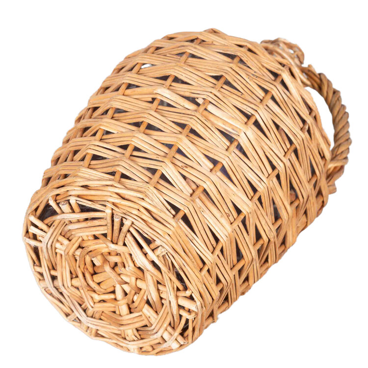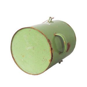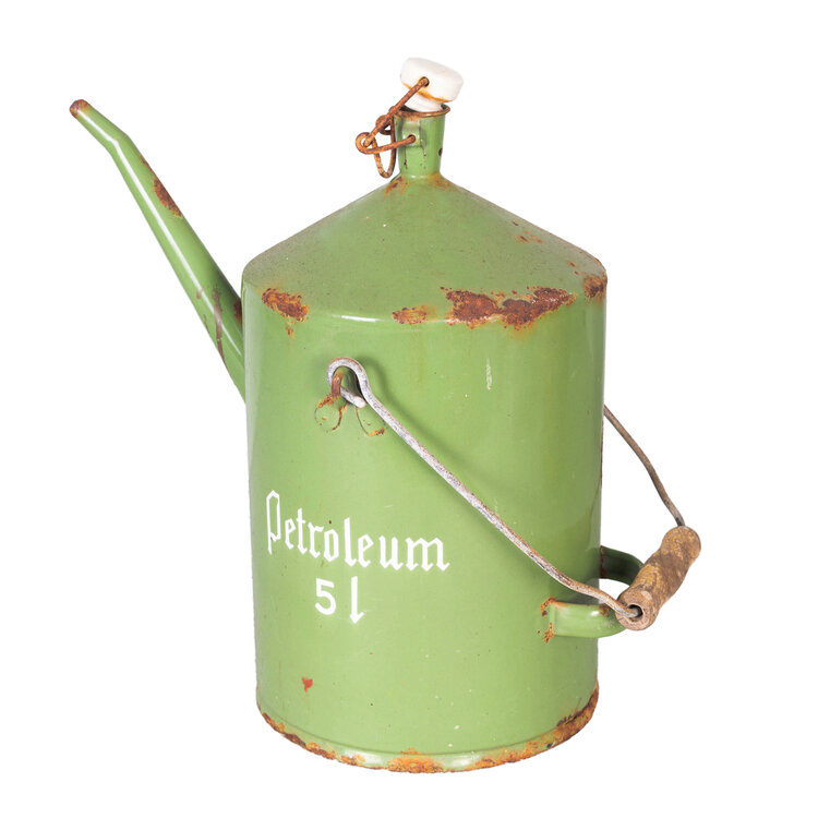 Geëmailleerde groene petroleumkan en rieten wijnfles met kurk. Datering 20ste eeuw. Petroleumkan met groen emaille en opschrift in witte letters "Petroleum 5 l". Het heeft een houten handvat en wit keramieken dop. De glazen mandfles is omweven met riet waarin een handvat verwerkt is. Bovenop een vierkante kurk. Conditie: de mandfles is nog in erg mooie staat; de petroleumkan toont roestplekken en beschadigingen in het hout. Afmetingen: petroleumkan: 33 x 34 x 19 cm; mandfles: 38 x 20 x 20 cm.
