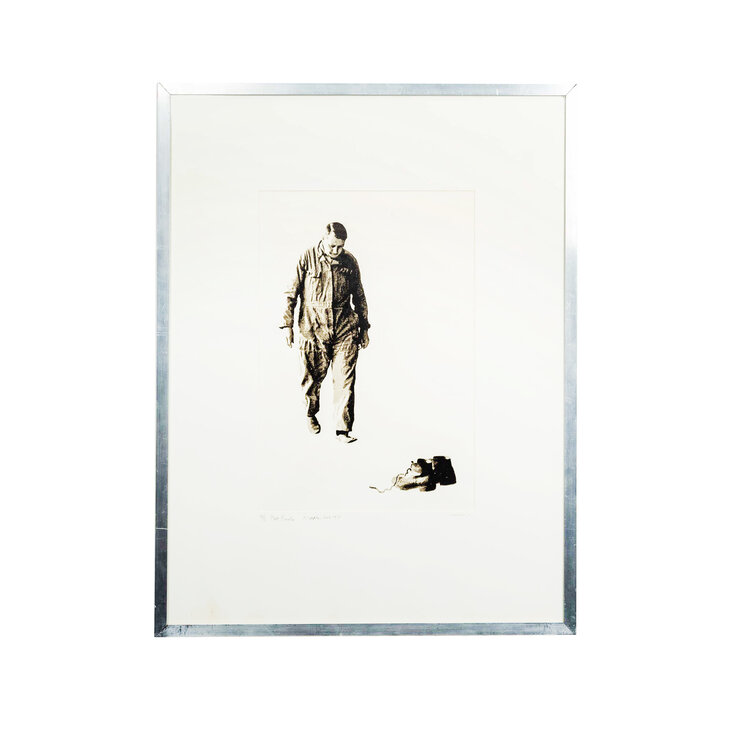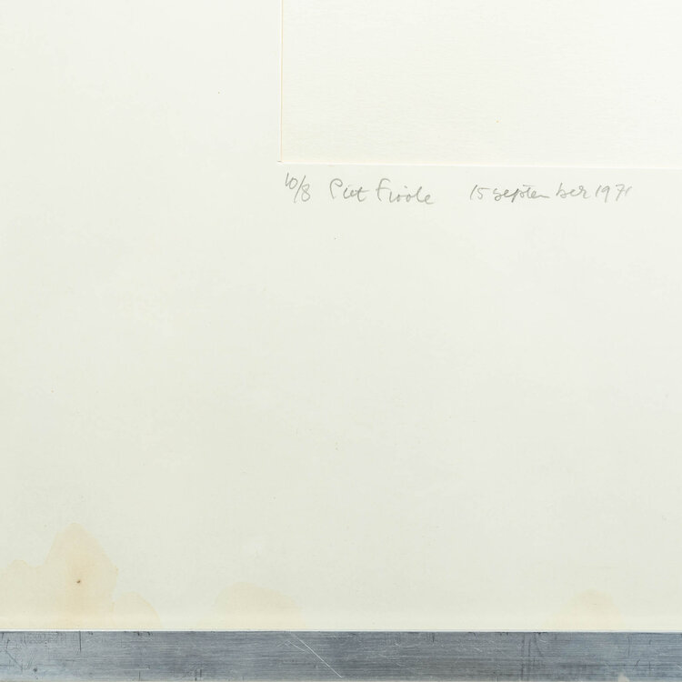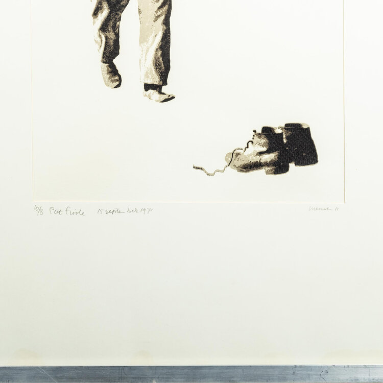 Piet Fioole (Halsteren (Bergen op Zoom), 1943), 'Mensen 11', 1971. Zeefdruk op papier in metalen lijst met passe-partout. Afbeelding van een man in werkoverall die naar zijn schoenen toe loopt. Linksonder 10/8, signatuur en 15 september 1971, rechtsonder 'mensen 11'. Piet Fioole is graficus, vooral bekend als zeefdrukker en fotograaf en voormalig directeur bij de kunstacademie in Den Bosch. Werk van Fioole is opgenomen in de collecties van het Rijksmuseum, het Centraal museum Utrecht en het Van Abbe museum. Conditie: passe-partout heeft vlekken, beschadigingen aan lijst. Afmetingen: beeldvlak 38 x 26 cm; lijst 65,5 x 50,5 cm.