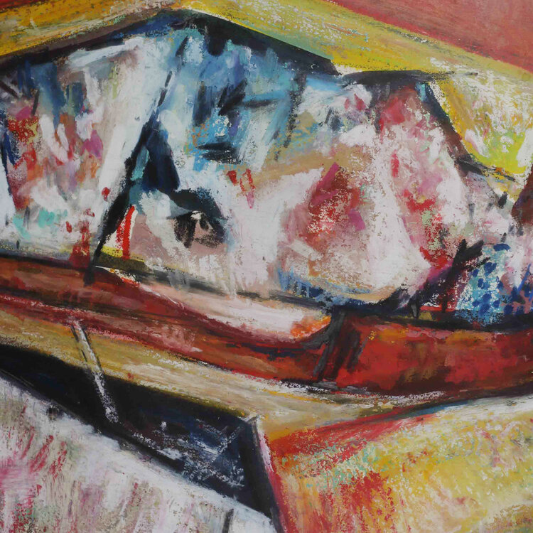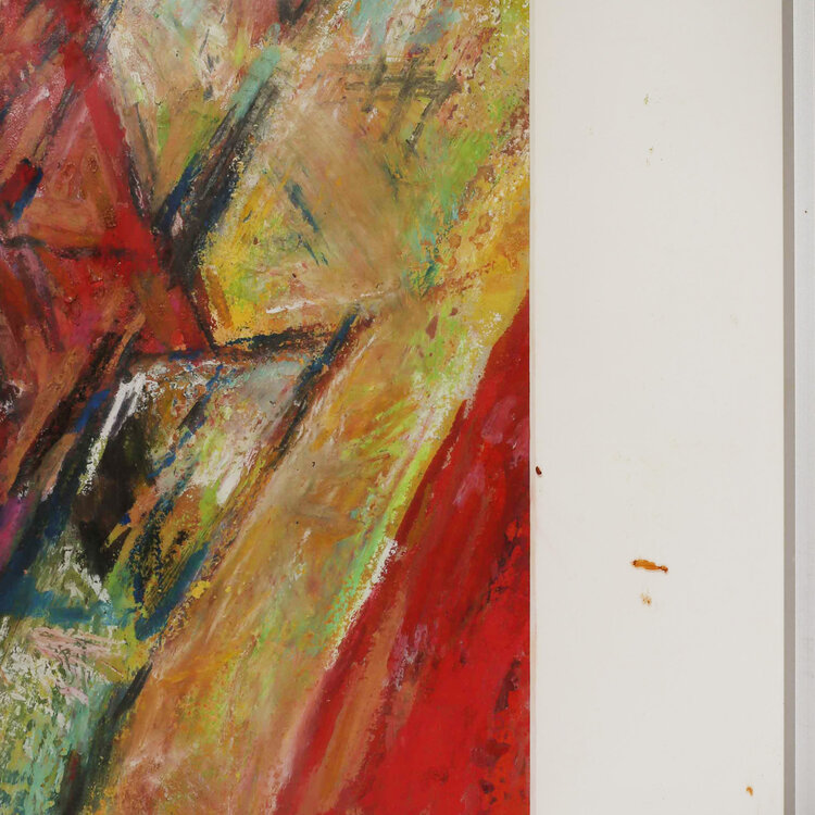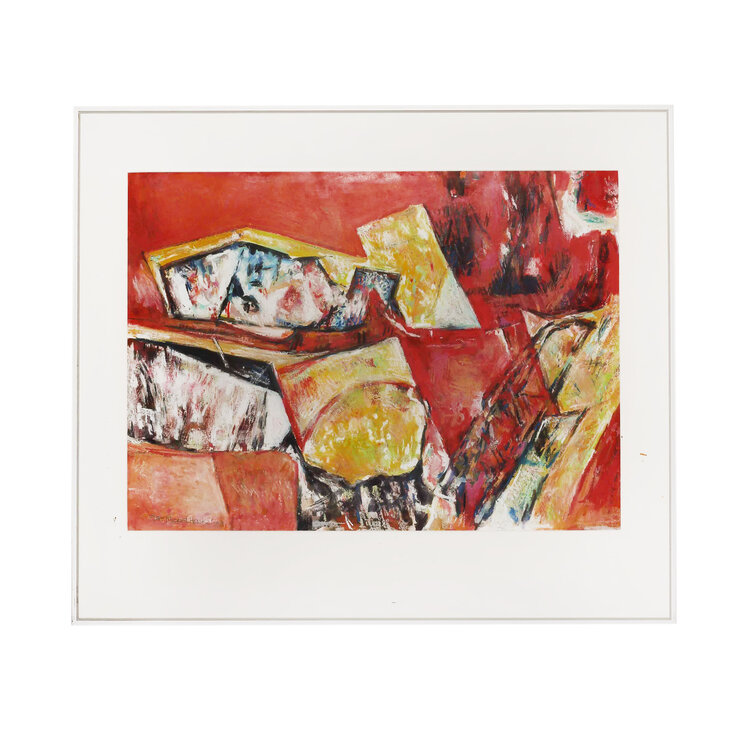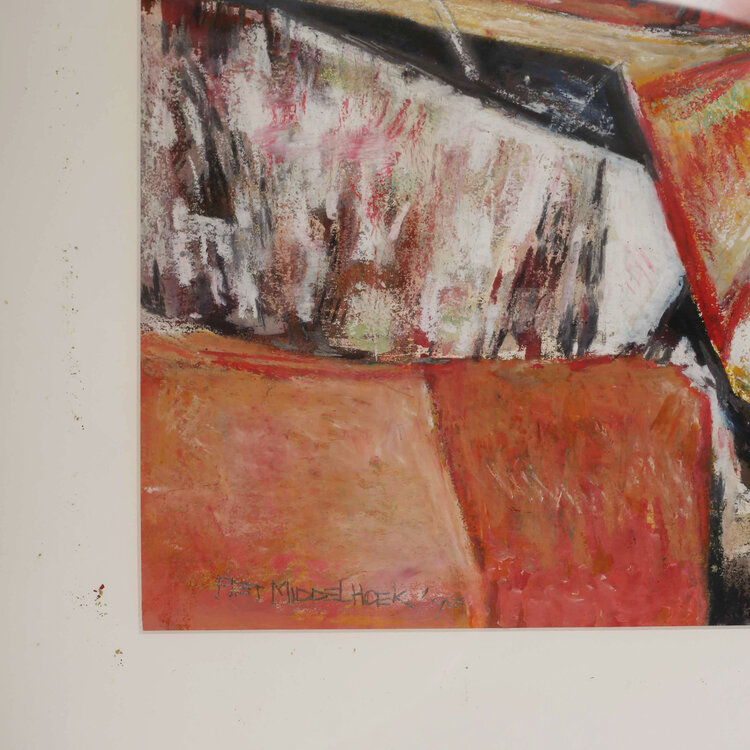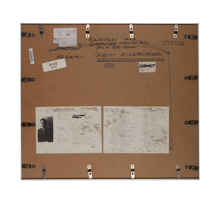 Piet Middelhoek, Kalahari, 1993. Gemengde techniek op papier in metalen lijst. Abstracte compositie in rood, geel, oranje en zwart. Signatuur en jaar linksonder. Aan de achterzijde een vel met informatie over de kunstenaar. Conditie: gebruikssporen aan de lijst. Afmeting lijst: 70 x 80 cm.