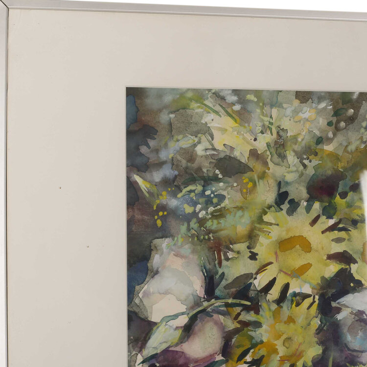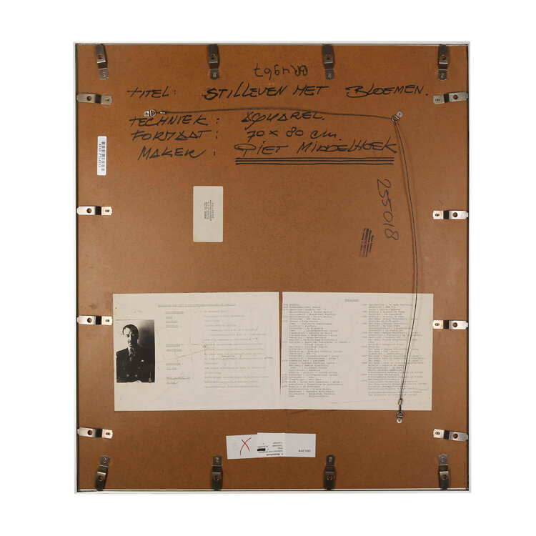 Piet Middelhoek, Stilleven met bloemen, jaartal onbekend. Aquarel op papier in metalen lijst. Kleurrijk stilleven van een vaas met diverse bloemen waaronder rozen en margrieten. Signatuur rechtsonder. Conditie: gebruikssporen aan lijst en linksboven een deukje het passe-partout. Afmeting lijst: 80 x 70 cm.