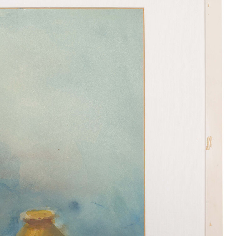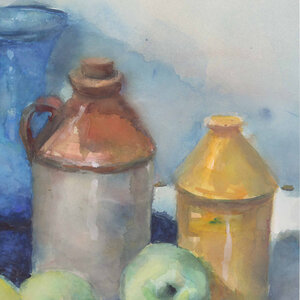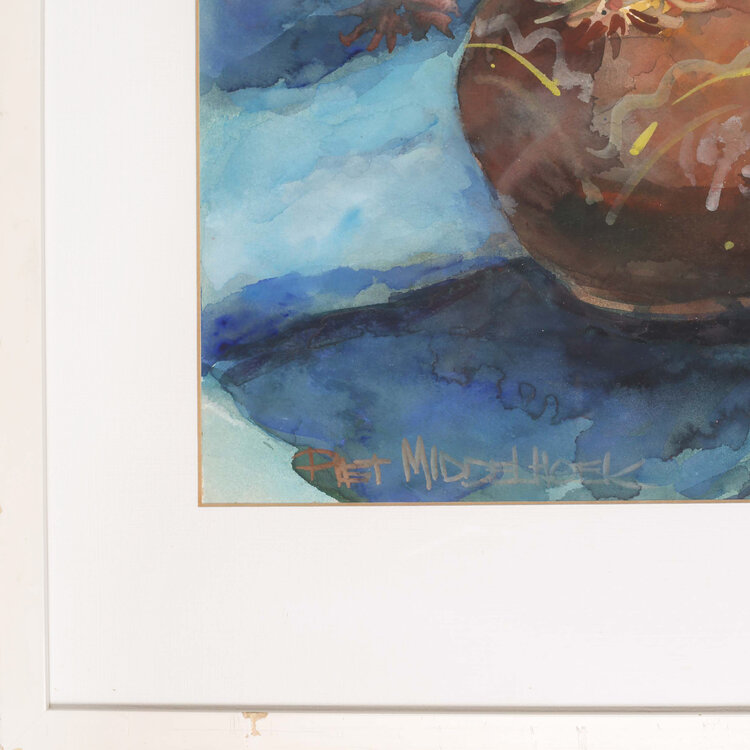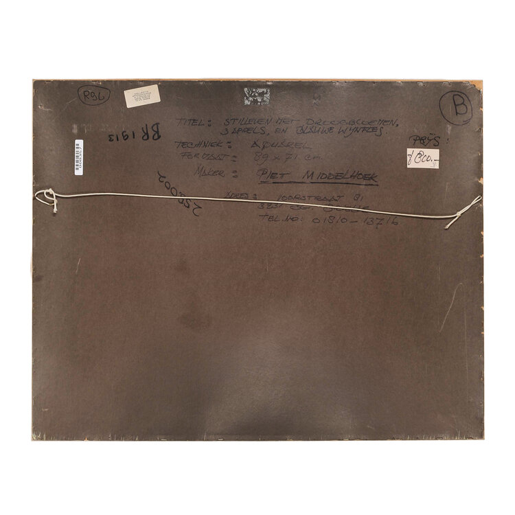 Piet Middelhoek, Stilleven met droogbloemen, drie appels en een blauwe wijnbes. Aquarel schilderij met enkele kannen en vazen. Afmetingen: 71x89 cm. Conditie: Lijst toont sporen van gebruik.