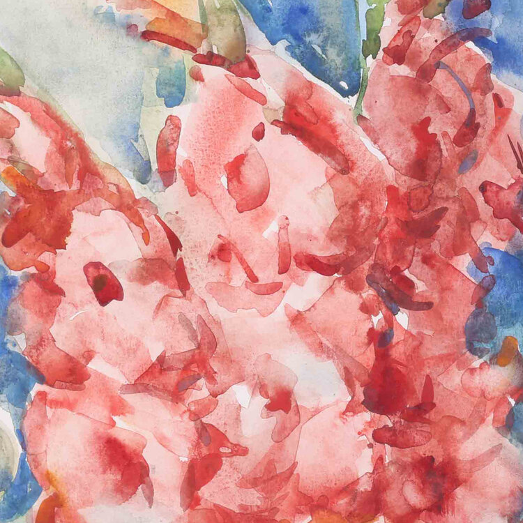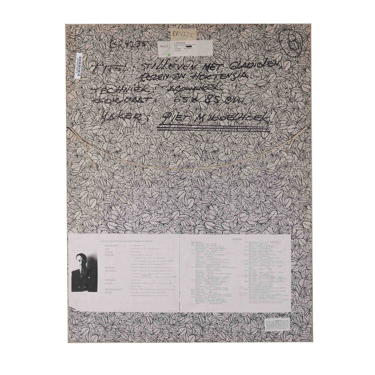 Piet Middelhoek, Stilleven met gladiolen, rozen en hortensia, 1991. Aquarel in witte lijst. Kleurrijk stilleven met een karaf met dop, vaas met gladiolen en daarvoor een bos rozen met hortensia. Signatuur linksonder. Conditie: paar beschadigingen aan de lijst. Afmeting werk zonder lijst: 67 x 45 cm.