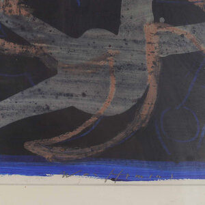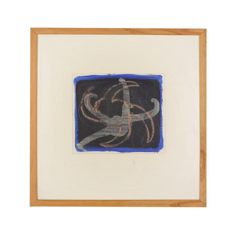 Piet Warffemius, Zonder Titel, 1994. Acryl op papier in houten lijst. Abstracte compositie in blauw, zwart en roze. Conditie: gebruikssporen aan de lijst. Afmeting lijst: 50 x 50 cm.