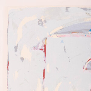 Piet Warffemius, Zonder titel, 1985. Zeefdruk op papier zonder lijst, oplage 36/40. Abstract werk met verschillende vormen in de kleuren rood, blauw en zwart. Signatuur middenonder. Conditie: het papier toont hier en daar gebruikssporen, aan de achterkant resten van tape. Afmeting papier: 80 x 60 cm.
