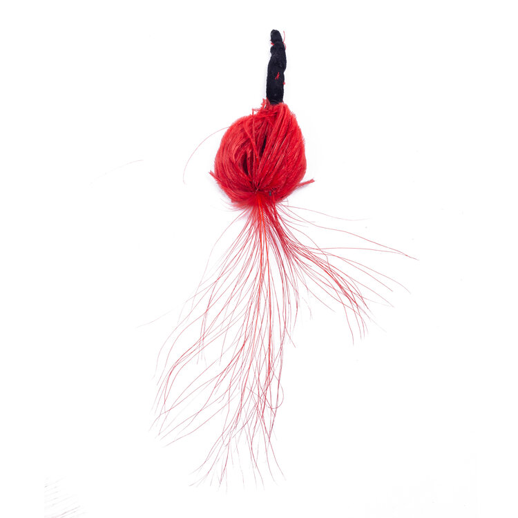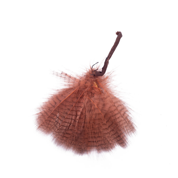 Pluimdecoratie van exotische veren. Bruine fazantveren samengebonden en vastgezet op een ijzerdraadje (ca 18 x 10 cm incl ijzerdraad); Rode veren samengebonden en vastgezet op een ijzerdraadje (ca 24 x 5 cm incl ijzerdraad). Datering: eerste helft 20ste eeuw. Conditie: de vintage veren zijn kwetsbaar en vertonen gebruikssporen.