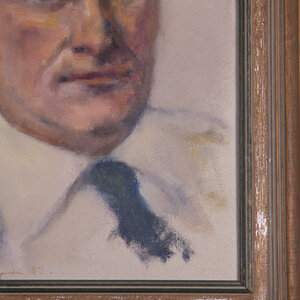 Theo Swagemakers, Portret Alex Brenninkmeijer, 1977. Olieverf op paneel, 40 x 30 cm. Fraai portret van meneer Alex Brenninkmeijer, gezien vanaf de schouders en iets naar rechts gekeerd. Gesigneerd linksonder en op achterzijde.