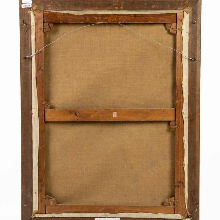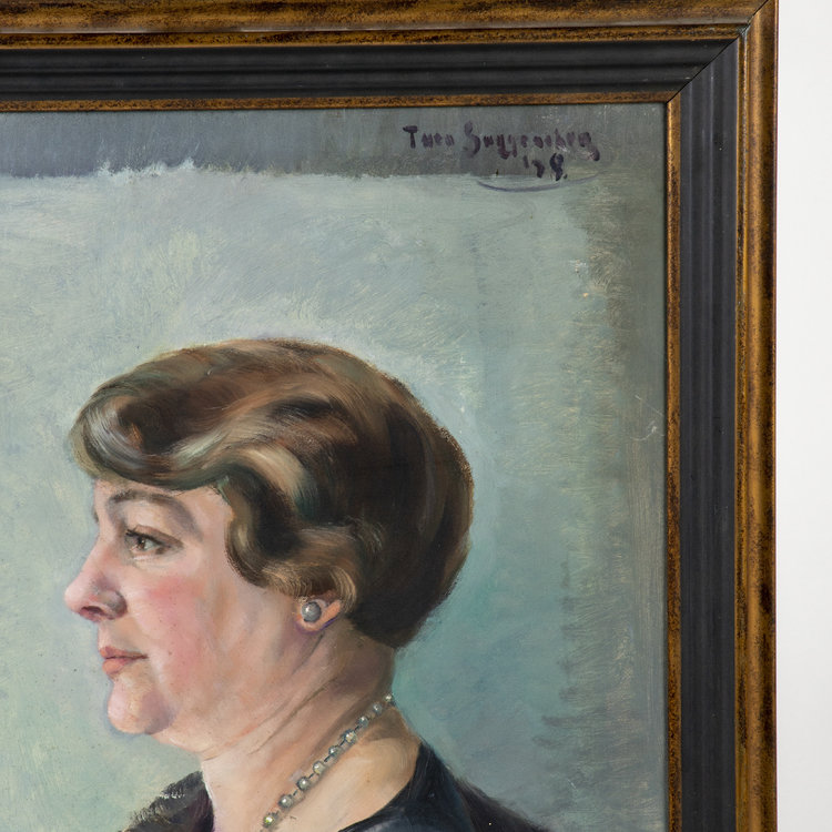Theo Swagemakers, Portret mevr. Snijders-Besseling, 1938. Gouache op doek, werk 80.5 x 60.5 cm, lijst 90.5 x 70.2 cm. Portret van een vrouw tegen een mooie blauwe achtergrond, en profil, gesigneerd rechtsboven. Theo Swagemakers (1898-1994) is een bekende Nederlandse schilder van voornamelijk portretten en stillevens. Hij genoot zijn opleiding in Brussel en Parijs en heeft verschillende beroemdheden mogen portretteren, zoals een groot deel van de Koninklijke familie. Hiervoor heeft hij de Thérèse van Duyl-Schwartzeprijs in ontvangst mogen nemen in 1958. Conditie: het werk is in matige conditie. Het doek is los op het spanraam gespannen waardoor het is wat is gebobbeld. Op enkele plekken is de verf beschadigd, met name op de onderste helft van het doek. De lijst heeft enkele gebruikssporen zoals lichte slijtage.
