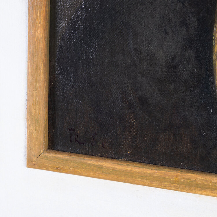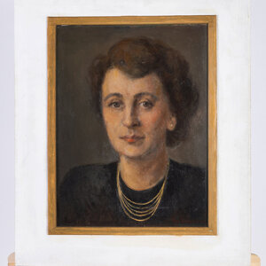 Theo Swagemakers, Portret van een vrouw, ca. 1970. Olieverf op doek, werk 40.3 x 30.3 cm, lijst 55.9 x 45.9 cm. Portret van een onbekende vrouw met een ketting in een witte lijst, gesigneerd rechtsonder. Theo Swagemakers (1898-1994) is een bekende Nederlandse schilder van voornamelijk portretten en stillevens. Hij genoot zijn opleiding in Brussel en Parijs en heeft verschillende beroemdheden mogen portretteren, zoals een groot deel van de Koninklijke familie. Hiervoor heeft hij de Thérèse van Duyl-Schwartzeprijs in ontvangst mogen nemen in 1958. Conditie: het werk is in prima conditie. Het vernis is wat vergeeld op sommige plekken. De lijst heeft lichte gebruikssporen, zoals lichte slijtage aan de onderzijde en enkele vegen.