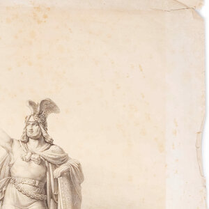 Lithografie met portret van 'Hermann der Cherusker Fürst', vervaardigd door Osterwald u. Wedemeyer. Hermann der Cherusker, in Nederland bekend als Arminius, was een Germaanse aanvoerder. Als veldheer slaagde hij erin de Romeinen een vernietigende slag toe te brengen in de Slag bij het Teutoburgerwoud. In de 19e eeuw stond hij symbool voor het Duits nationalisme. Op de litho is het 53,5 meter hoge standbeeld (Hermannsdenkmal) afgebeeld, wat tussen 1838 en 1875 in het Teutoburger Woud werd gebouwd. Datering: eind 19de eeuw. Conditie: beschadigd aan de randen, bovenin ook wat grotere scheuren, en foxing vlekken. Afmetingen papier: ca. 63,8 x 47,2 cm.