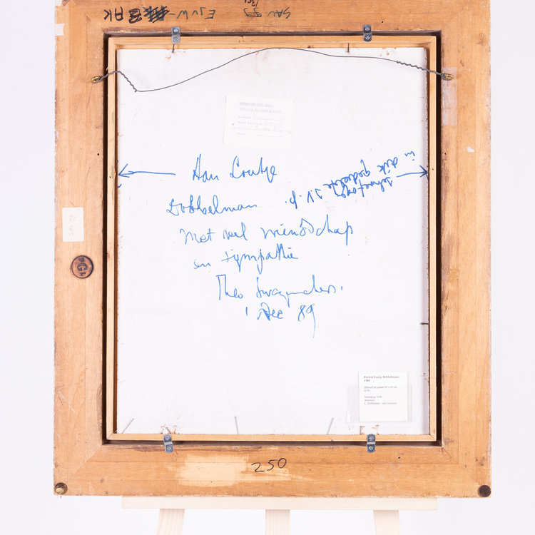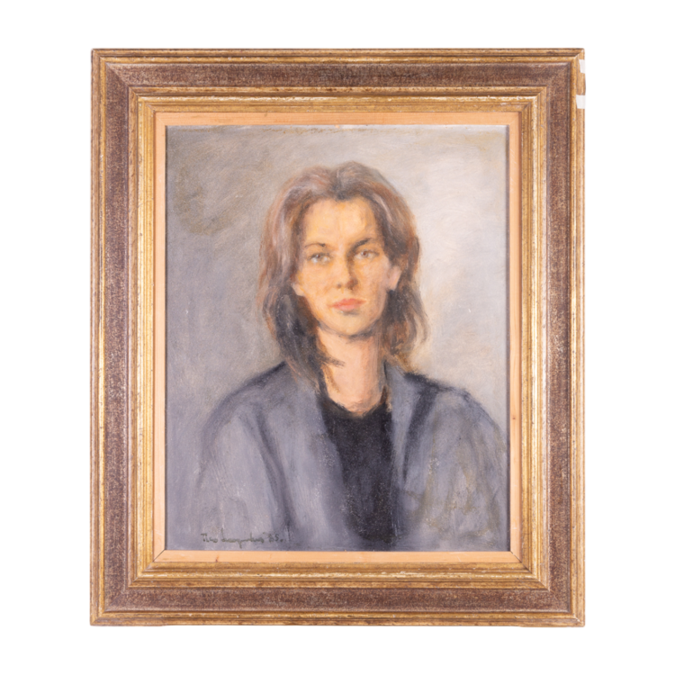 Theo Swagemakers, Portret van Loutje Dobbelman, 1985. Olieverf op paneel, werk 60 x 50 cm, lijst 80 x 70 cm. Fraai portret van een vrouw geschilderd in grove toets. Gesigneerd linksonder en ingelijst in een houten goudkleurige lijst. Theo Swagemakers (1898-1994) is een bekende Nederlandse schilder van voornamelijk portretten en stillevens. Hij genoot zijn opleiding in Brussel en Parijs en heeft verschillende beroemdheden mogen portretteren, zoals een groot deel van de Koninklijke familie. Hiervoor heeft hij de Thérèse van Duyl-Schwartzeprijs in ontvangst mogen nemen in 1958. Conditie: het werk is in prima tot redelijke conditie. Hier en daar is een stukje verf afgebladderd. De lijst heeft gebruikssporen.