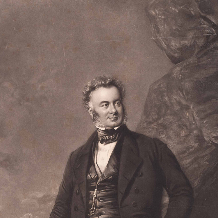Portret van William Mackenzie, International railway contractor, door Ward, Illidge. Een mezzotint/ gravure door George Raphael Ward naar een portret gemaakt door Thomas Henry Illidge. Het origineel is geschilderd tussen 1844 en 1851. Het portret is van de Brits bouwkundig ingenieur William Mackenzie (1794 - 1851). Conditie: De prent heeft sporen van ouderdom, zoals vlekken en verkleuring. Er zitten kreuken, vouwen en beschadigingen in het papier en bovenin zit een scheur. Potloodkrassen aan de onderkant. Afmetingen: ca. 65 x 42 cm.