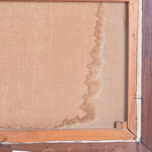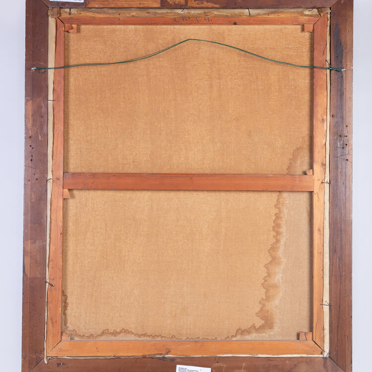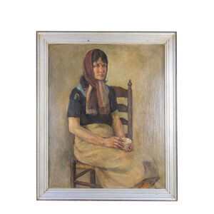 Theo Swagemakers, Portret vrouw op een stoel, 1939. Olieverf op doek, werk 107 x 88.5 cm, lijst 114.4 x 95.4 cm. Indrukwekkend portret van een oudere vrouw, geschilderd in kalme tinten. Desondanks is het portret levendig geschilderd, met details in het gezicht en de handen. De blik van de vrouw is onleesbaar; ze lijkt in gedachten verzonken te zijn. Gesigneerd linksonder. Theo Swagemakers (1898-1994) is een bekende Nederlandse schilder van voornamelijk portretten en stillevens. Hij genoot zijn opleiding in Brussel en Parijs en heeft verschillende beroemdheden mogen portretteren, zoals een groot deel van de Koninklijke familie. Hiervoor heeft hij de Thérèse van Duyl-Schwartzeprijs in ontvangst mogen nemen in 1958. Conditie: het werk is in prima tot redelijke conditie. Enige sporen van craquelé van de verf. Op sommige plekken zijn kleine stukjes verf van het oppervlak afgebladderd, zoals linksonder. De lijst vertoont enige gebruikssporen en tekenen van ouderdom, zoals slijtage van de verf.