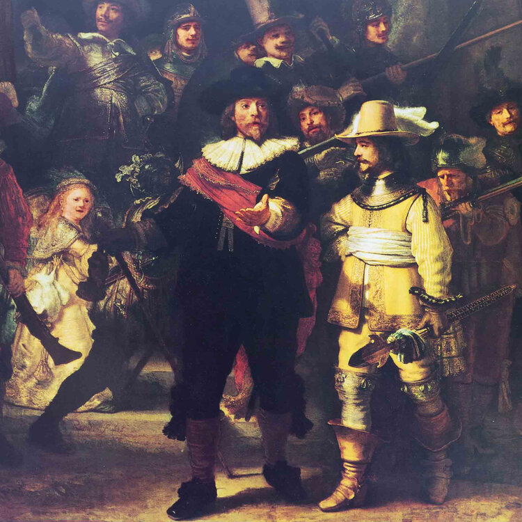 Poster van het schilderij 'De Nachtwacht' van Rembrandt van Rijn (1606-1669). Het welbekende werk van Rembrandt uit 1642 wat in het Rijksmuseum in Amsterdam hangt. Rondom het werk is een wit kader. Conditie: goed met enkel lichte gebruikssporen aan de randen en hoeken. Afmetingen ca: 54 x 71 cm.
