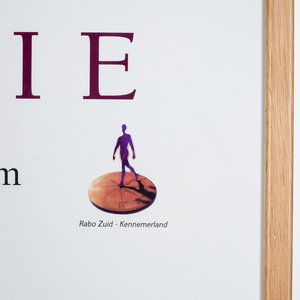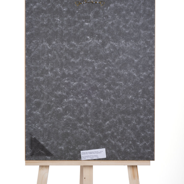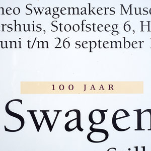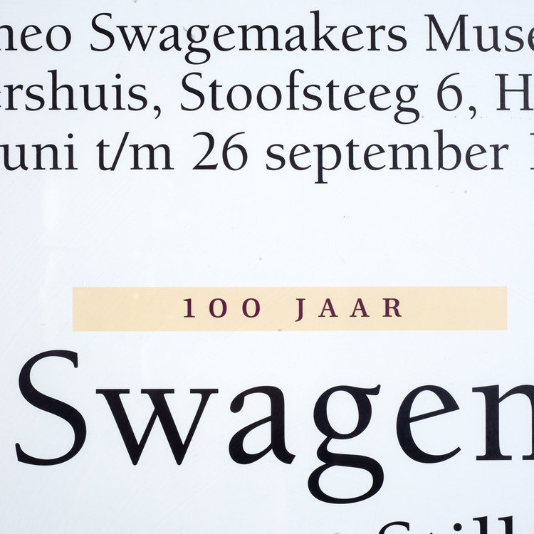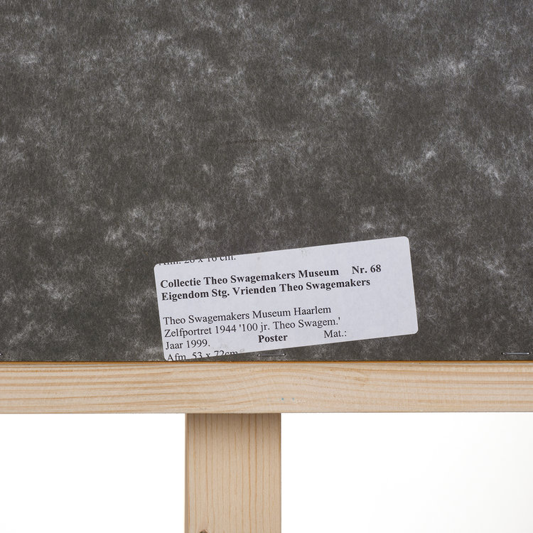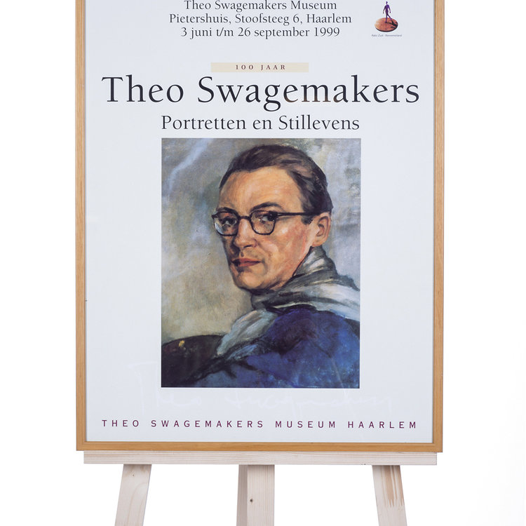 Poster van de tentoonstelling '100 jaar Theo Swagemakers', 1999. Op de poster is Theo Swagemakers afgebeeld in de vorm van een zelfportret uit 1944. Theo Swagemakers (1898-1994) is een bekende Nederlandse schilder van voornamelijk portretten en stillevens. Hij genoot zijn opleiding in Brussel en Parijs en heeft verschillende beroemdheden mogen portretteren, zoals een groot deel van de Koninklijke familie. Hiervoor heeft hij de Thérèse van Duyl-Schwartzeprijs in ontvangst mogen nemen in 1958. Datering: 1999. Conditie: de poster is in goede conditie. De lijst heeft lichte gebruikssporen. Afmetingen: ca. 72 x 52 cm.