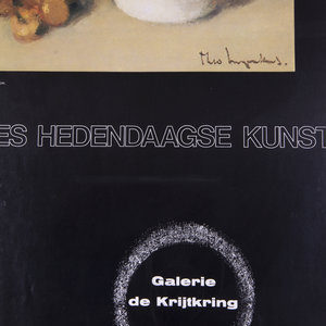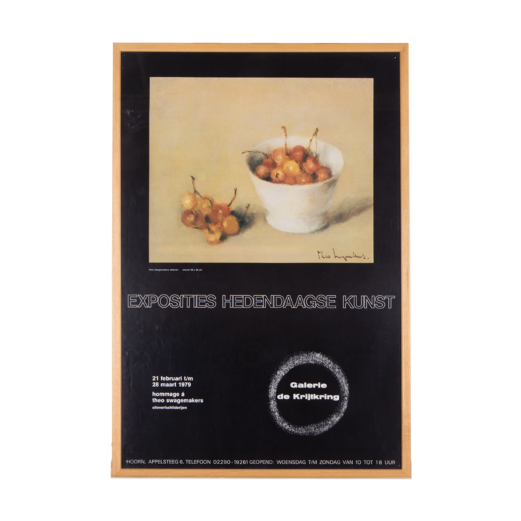 Poster van de tentoonstelling 'Exposities Hedendaagse Kunst' bij Galerie de Krijtkring, waarop een stilleven is afgebeeld. Theo Swagemakers (1898-1994) is een bekende Nederlandse schilder van voornamelijk portretten en stillevens. Hij genoot zijn opleiding in Brussel en Parijs en heeft verschillende beroemdheden mogen portretteren, zoals een groot deel van de Koninklijke familie. Hiervoor heeft hij de Thérèse van Duyl-Schwartzeprijs in ontvangst mogen nemen in 1958. Datering: 1979. Conditie: de poster is in goede conditie. De lijst heeft lichte gebruikssporen. Afmetingen: ca. 64 x 43.5 cm.