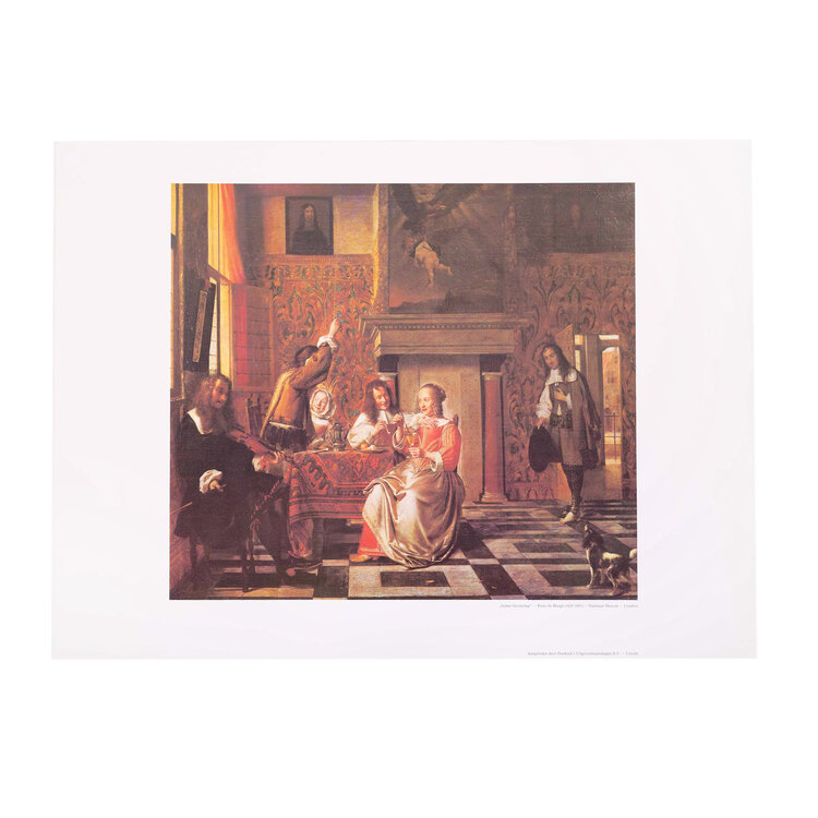Ingelijste poster van het schilderij 'Galant Gezelschap' van Pieter de Hoogh (1629-1681). Afbeelding van een groep drinkende mensen om tafel in een 17-de eeuws interieur. Links een viool spelende man en rechtsonder een hond. Rondom het werk is een wit kader met rechtsonder te lezen: '"Galant Gezelschap" - Pieter de Hoogh (1629-1681) - Nationaal Museum - Lissabon.' Conditie: de poster heeft in het witte kader wat kreukeltjes, maar is verder in prima staat. De poster is iets te klein voor de lijst, waardoor er bovenin een klein randje te zien is. De lijst heeft lichte gebruikssporen. Afmetingen: ca. 52 x 69 cm.