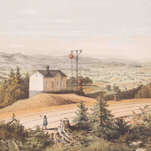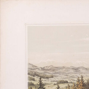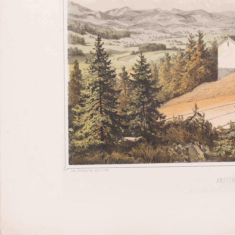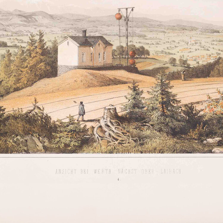 Prent 'Ansicht bei Werth nächst Ober-Laibach' door Jan Novopacky, Reiffenstein & Rosch. Datering: 1857. Kleurenlitho van gezicht op Werth bij Ober-Laibach. Ter herdenking van de opening van de staatsspoorweg van Ljubljana naar Triëst onder toezicht van Keizer Franz Josef I op 27 juli 1857. The National and University Library in Ljubljana is ook in het bezit van een exemplaar van deze prent. Conditie: De prent heeft sporen van ouderdom, zoals verkleuring, met name aan de randen. Afmetingen: ca. 34 x 50 cm.