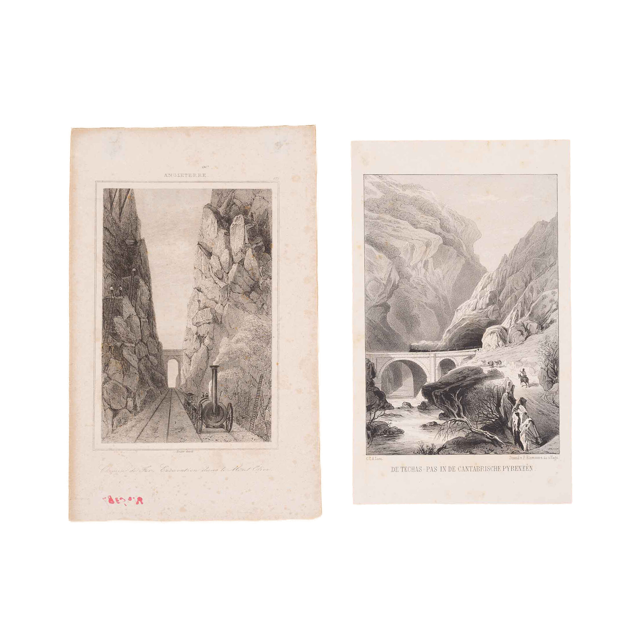 Prent 'Chemin de Fer, Excavation dans le Mont Olive', Lemaitre naar T.T. Bury. Ets en gravure van graafwerkzaamheden bij de aanleg van The Liverpool and Manchester Railway. The Liverpool and Manchester Railway was een belangrijke spoorweg die inspeelde op de toenemende commerciële en industriële vraag naar sneller vervoer van goederen en materialen. Datering: circa 1840; Prent 'De Techas-pas in de Cantabrische Pyreneën', steendruk van P. Blommers te 's Hage naar C.C.A. Last. Litho van een stoomtrein rijdend over een viaduct door een berglandschap. Datering: circa 1850. Conditie: De prenten hebben sporen van ouderdom, zoals vlekken en verkleuring, Kleine beschadigingen aan de randen. Op de achterkant van 'Chemin de Fer, Excavation dans le Mont Olive' is met rode stift geschreven, wat doorgedrukt is en zichtbaar is aan de voorkant. Afmetingen van papier prent: ca. 22 x 14 cm. 'De Techas-pas in de Cantabrische Pyreneën' is vastgeplakt in het mapje. Afmetingen van papier prent: ca. 20,5 x 12,5 cm.