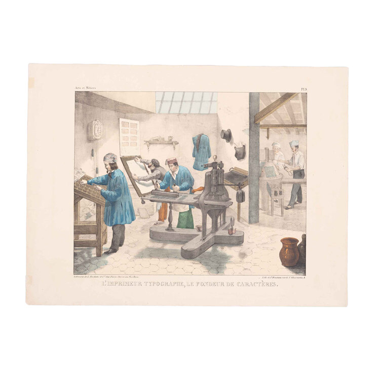 Prent 'L'imprimeur typographe, le fondeur de caractères', lithografie van Pierre de Bineteau. De afbeelding is Pl. 10 uit de serie 'Arts et Métiers' uitgegeven door L. Hachette et Cie. Afgebeeld is de werkplaats van een drukkerij met lithograaf en diepdrukker aan het werk. De litho is met de hand ingekleurd. Datering: ca. 1840. Conditie: goed, met hier en daar vlekjes en verkleuring; links taperesten. Afmetingen: ca. 35,5 cm x 48,5 cm.