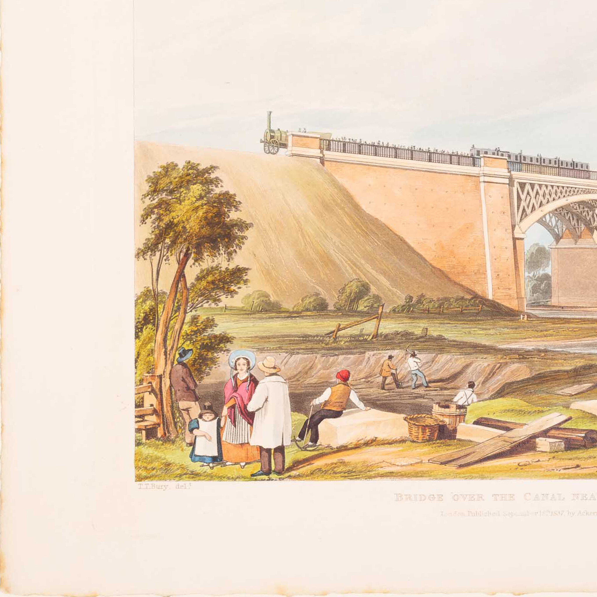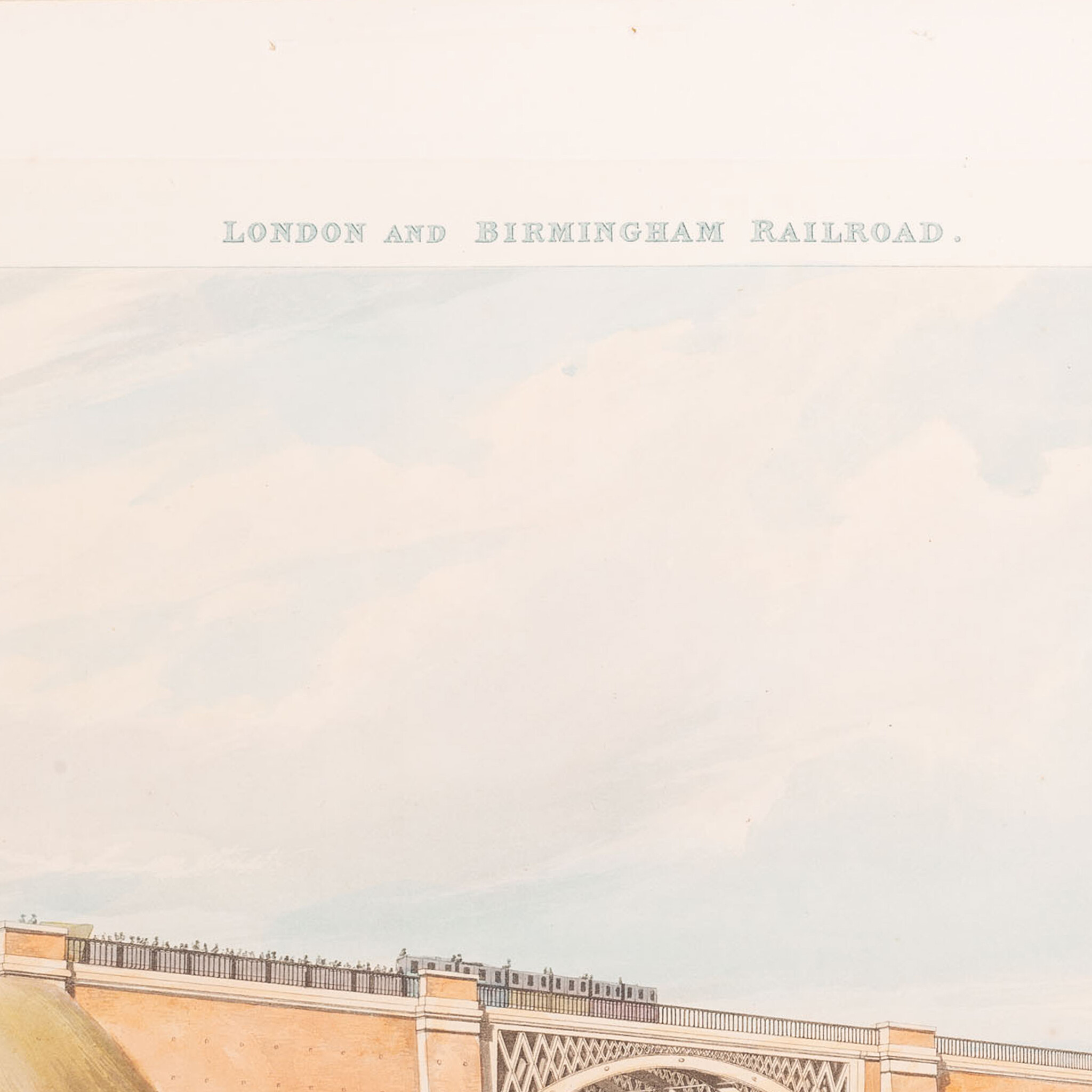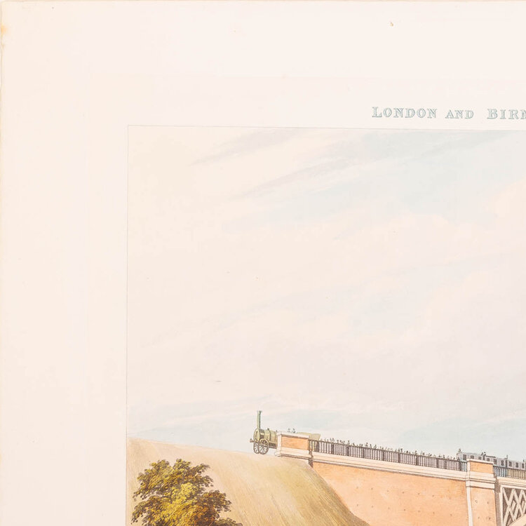 Prent 'London & Birmingham Railroad. The station at Euston Square'. Ets van J. Harris naar een werk van T.T. Bury, Ackermann & Co. Het station aan Euston Square was het eindpunt van de London & Birmingham Railway en werd geopend in 1837. Plaat 1 uit de collectie 'Six Coloured Views on the London and Birmingham Railway' van Thomas Talbory Bury, gepubliceerd in 1837. The British Museum is ook in het bezit van een exemplaar van deze prent. Datering: 1837. Conditie: De prent heeft sporen van ouderdom. Verkleuring, vlekken en kleine beschadigingen aan de randen. Afmetingen van papier prent: 29,5 x 35,5 cm.