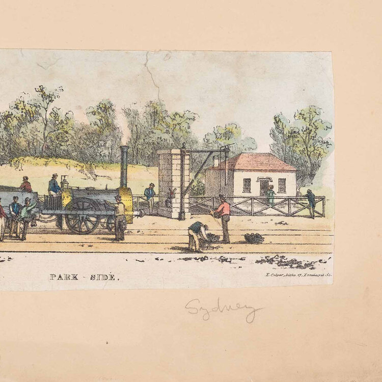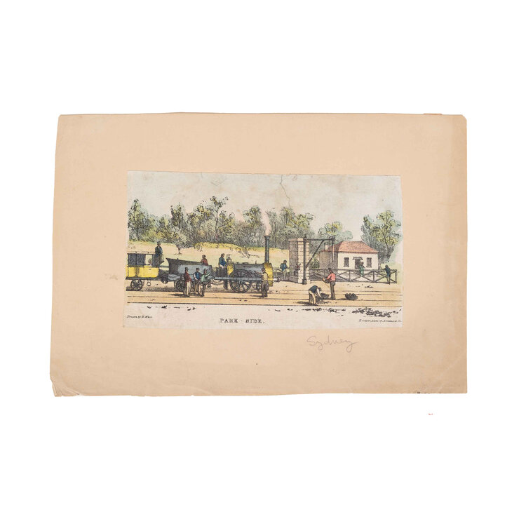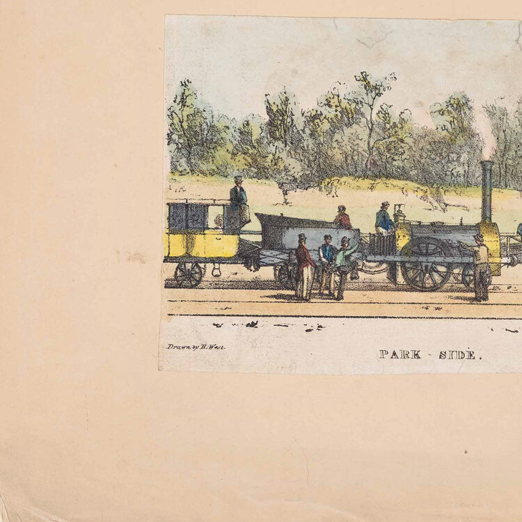 Prent 'Park Side', door E. Colyer naar een tekening van H. West. Parkside station, Liverpool and Manchester Railway. De vroegste stations hadden geen gebouwen en geen perrons, zoals op deze afbeelding van het station Parkside bij Newton-le-Willows aan de lijn Liverpool-Manchester. De passagiers klommen vanaf de grond in de wagons. Datering: circa 1830-1840. Conditie: De prent is geplakt op een groter stuk papier en onder de prent staat met potlood 'Sydney' geschreven. De prent heeft sporen van ouderdom. Verkleuring, vlekken en beschadigingen aan de randen. Er zitten scheurtjes en vouwen in het papier. Afmetingen van papier: ca. 21 x 31 cm.