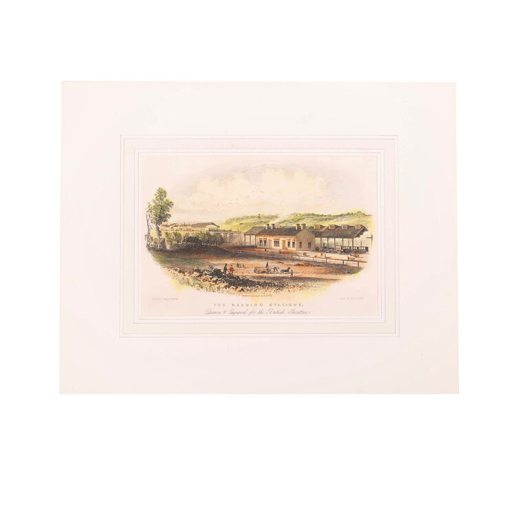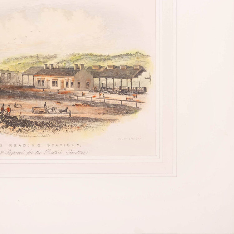 Prent 'The Reading Stations', getekend en gegraveerd door A. Ashley, gepubliceerd door H. Collins voor de British Gazetteer. Afbeelding van de stations van Reading, onderdeel van de Great Western Railway. Datering: circa 1850. Conditie: De prent heeft sporen van ouderdom. Verkleuring, vlekken en kleine beschadigingen aan de randen. Afmetingen van papier prent: ca. 16,5 x 25 cm.