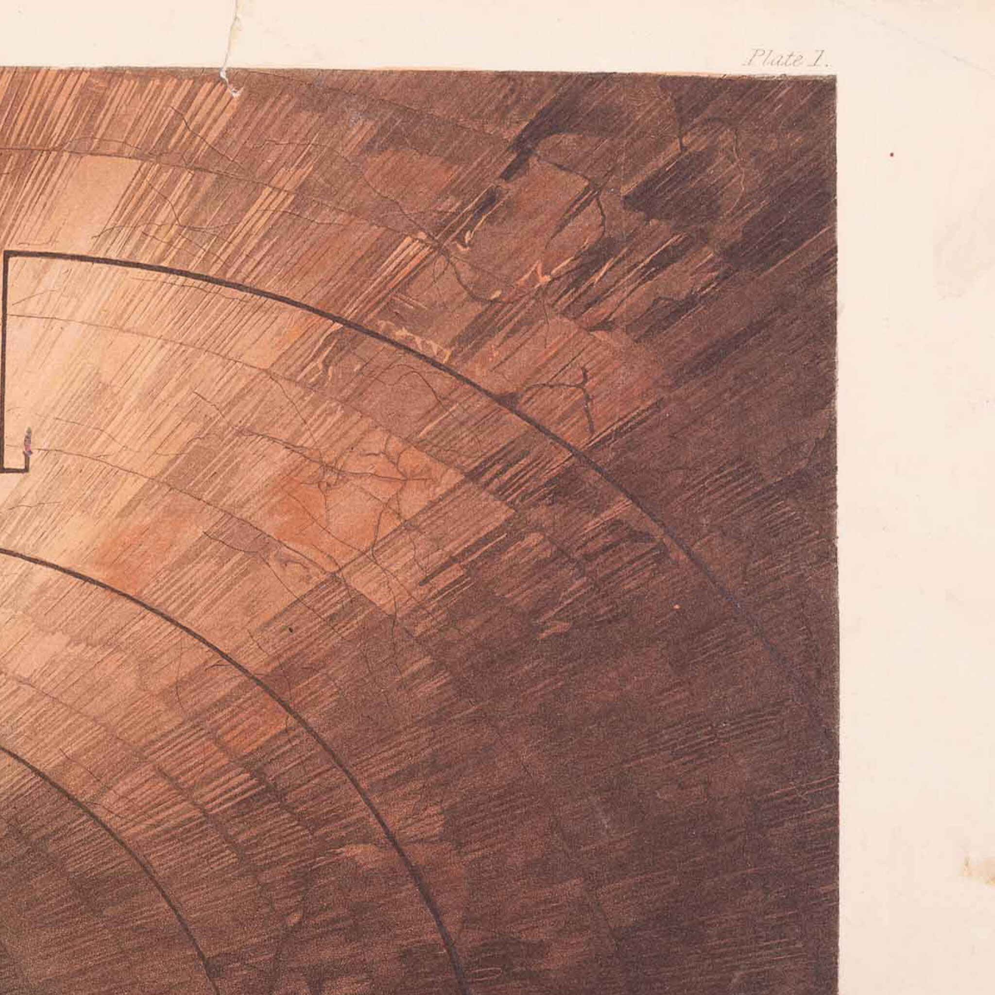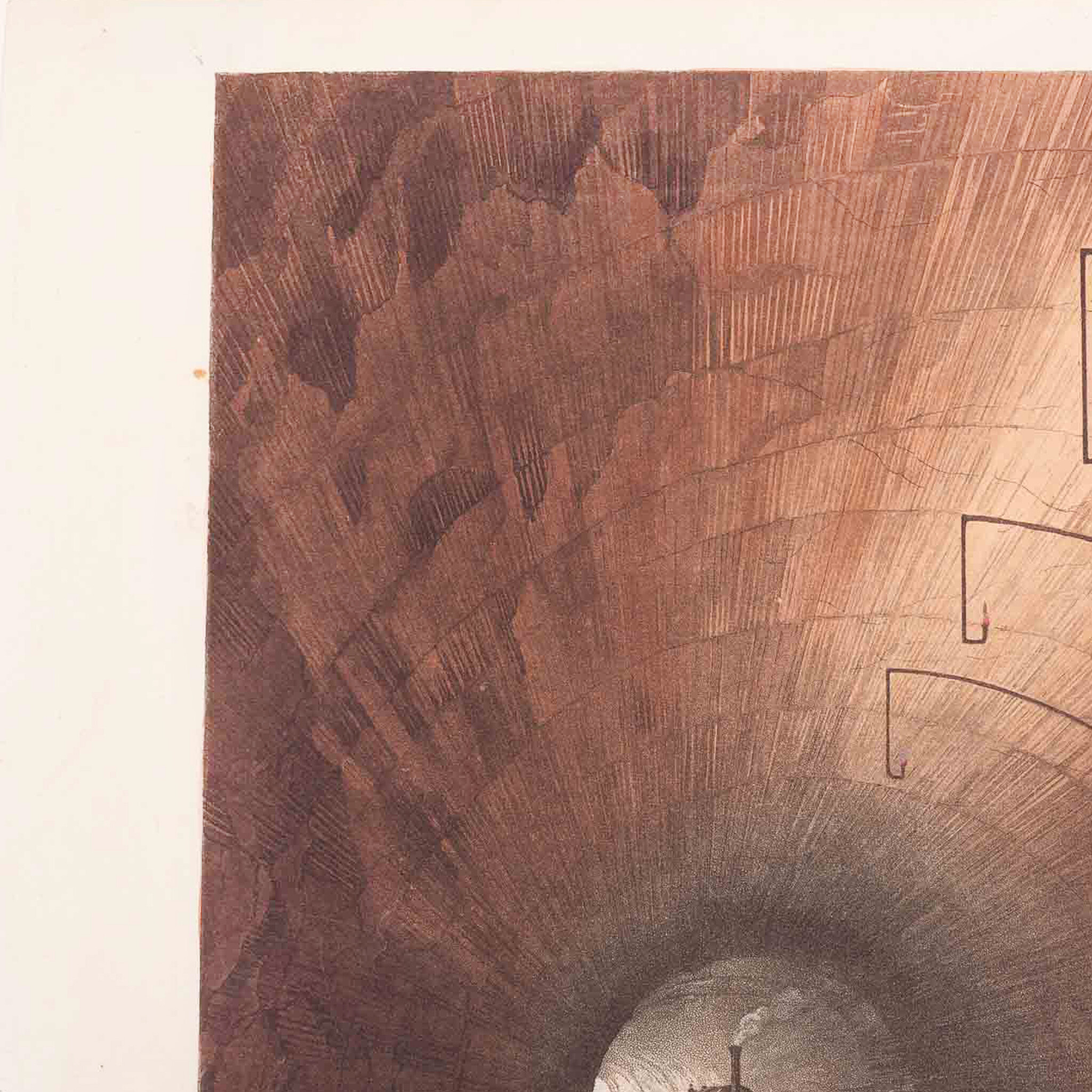 Prent 'The Tunnel', gegraveerd door H. Pyall naar T.T. Bury. De Tunnel in Liverpool, onderdeel van the Liverpool and Manchester Railway. Het was de eerste passagiersspoorlijn ter wereld en werd geopend op 15 september 1830. Uit de serie: Coloured Views on the Liverpool and Manchester Railway. Datering: circa 1831. Conditie: De prent heeft sporen van ouderdom. Verkleuring, vlekken en kleine beschadigingen aan de randen. Afmetingen van papier prent: ca. 26 x 36 cm.