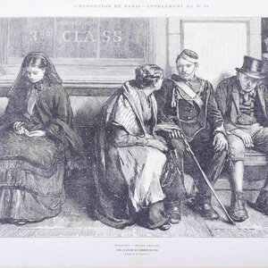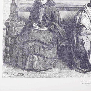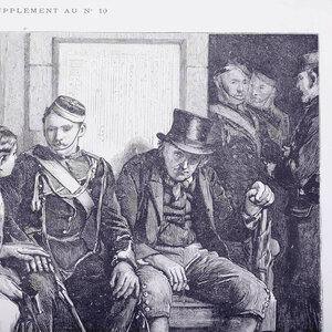Prent 'Une station de chemin de fer'. Naar een werk van Frank Holl. De prent toont passagiers die wachten op een trein op het perron, 3e klas. Geschiedenis van de Victoriaanse spoorwegen van de 19e eeuw. De prent komt uit een magazine, de vouwlijn in het midden van de prent is zichtbaar. Datering: eind 19e eeuw. Conditie: De prent heeft sporen van ouderdom. Verkleuring, vlekken en kleine beschadigingen aan de randen. Afmetingen van papier prent: 37 x 52,5 cm.