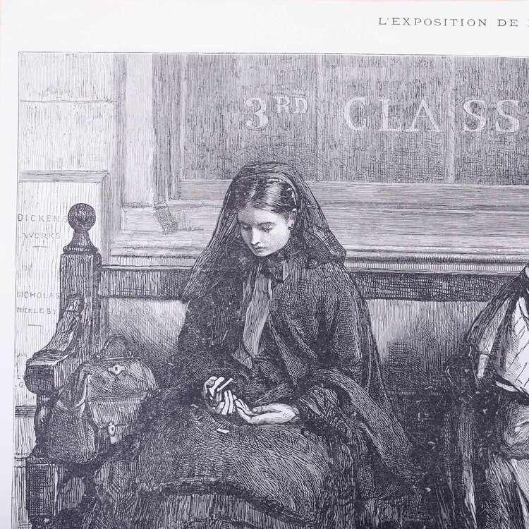Prent 'Une station de chemin de fer'. Naar een werk van Frank Holl. De prent toont passagiers die wachten op een trein op het perron, 3e klas. Geschiedenis van de Victoriaanse spoorwegen van de 19e eeuw.