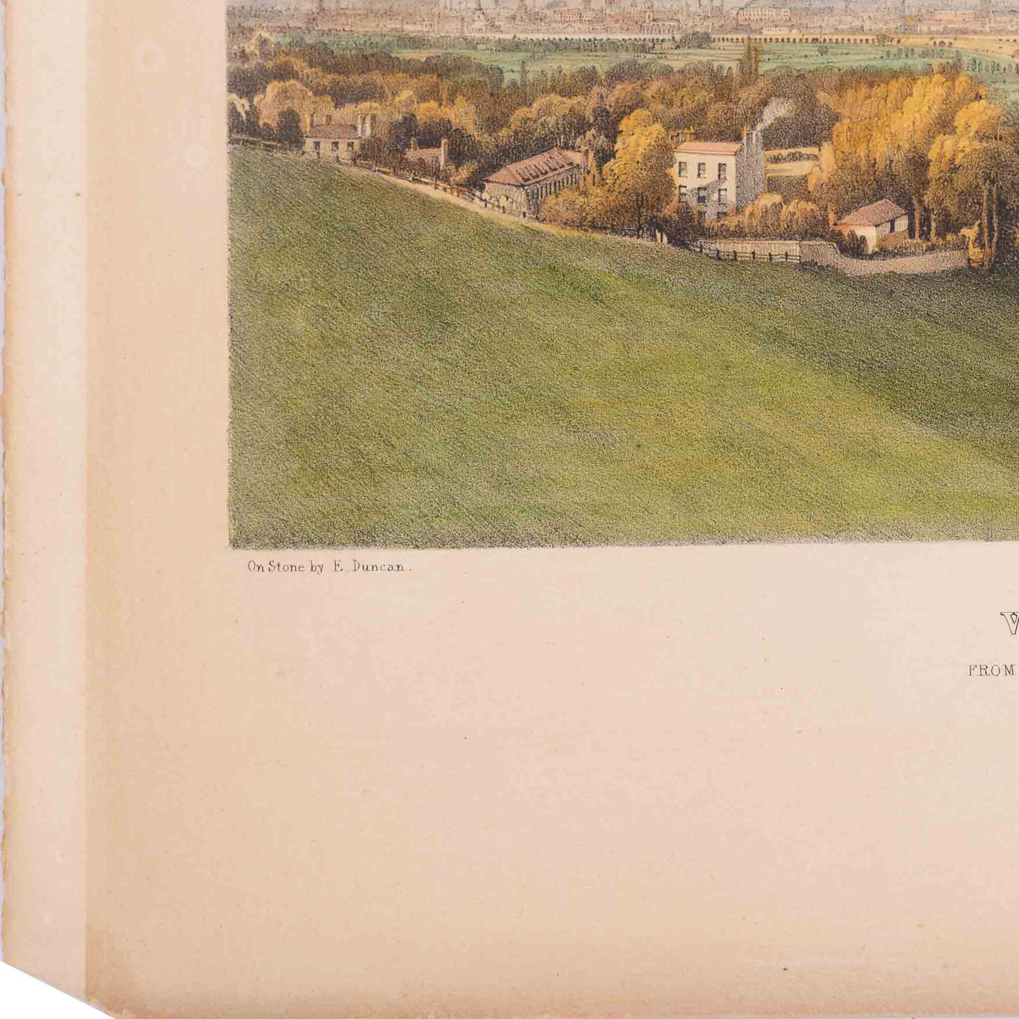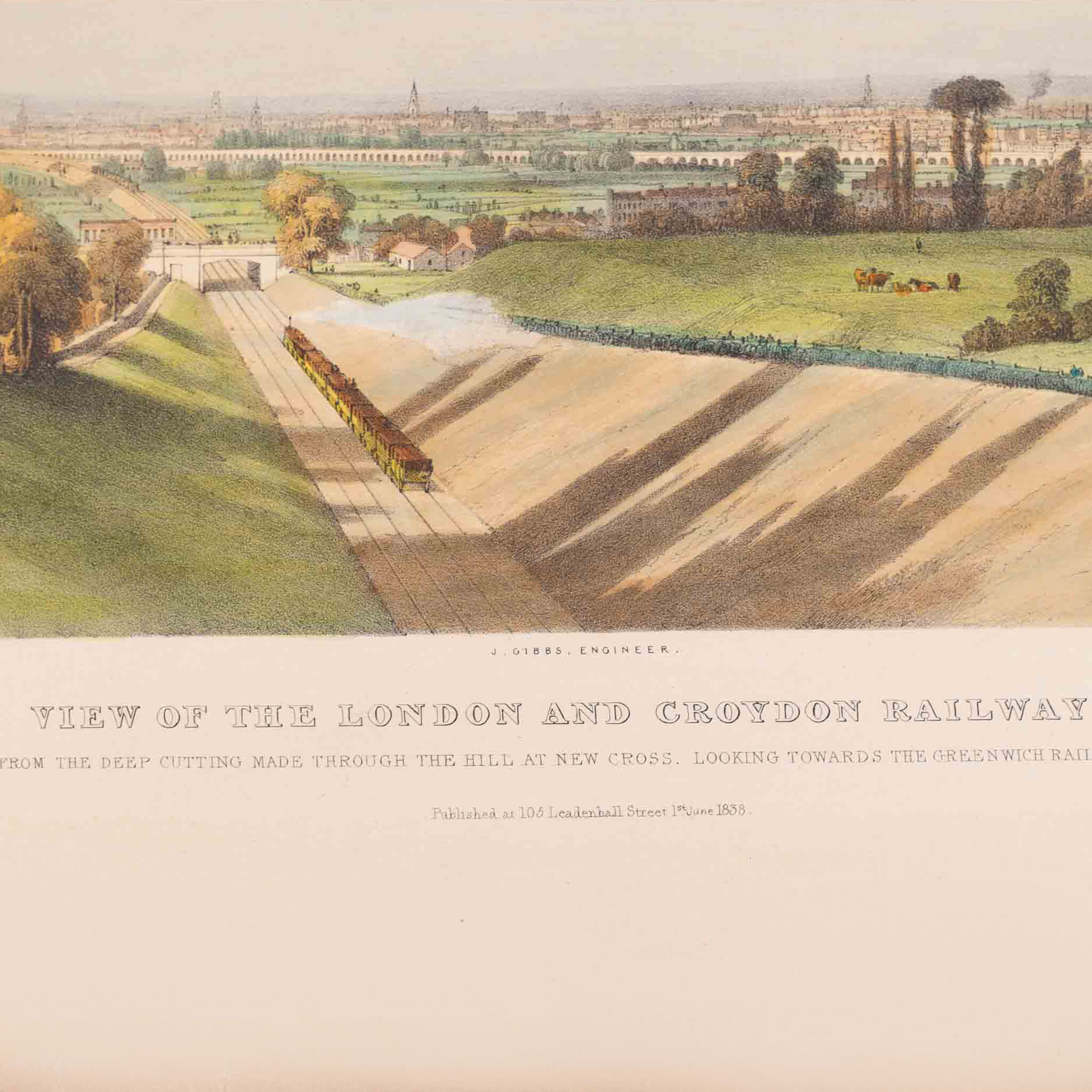 Prent 'View of the London and Croydon Railway', kleuren lithografie van een tekening van E. Duncan, uitgegeven door Day & Haghe in 1838. De prent zit in een zwart metalen lijst. De London-Croydon spoorweg werd geopend in de periode die bekend staat als 'spoorwegmanie' toen spoorwegen zich over heel Groot-Britannië uitbreidden. Op de prent is de impact van deze nieuwe spoorwegen op het landschap afgebeeld. In een dieptesnede is een stoomlocomotief te zien die in de richting van Londen rijdt. De tekenaar Edward Duncan (1803-1882) woonde en werkte in Londen en was aquarellist van landschappen, aquatint graveur en lithograaf van zee-, sport- en topografische voorstellingen naar zijn tijdgenoten. Datering: 1838. Conditie: De prent toont sporen van ouderdom en gebruik, zoals verkleuring en hier en daar wat schade aan de randen. Gebruikssporen lijst. Afmetingen: lijst ca. 50,5 x 65,5 cm; beeldvlak ca. 28 x 48,5 cm.