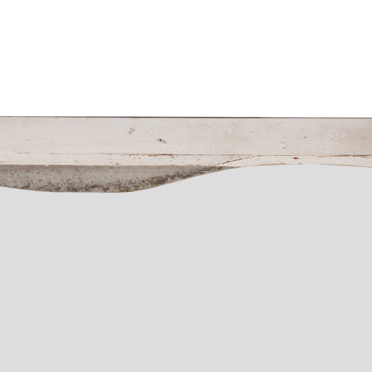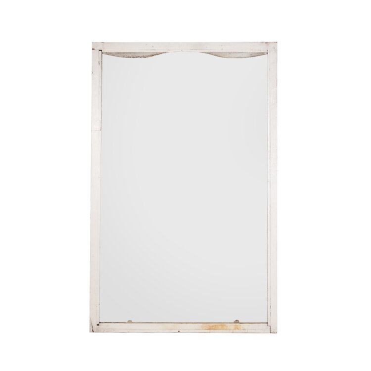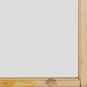 Raam van vitrine, eind 19e eeuw/begin 20ste eeuw. Raam met een crèmekleurig houten kozijn en authentiek glas. Het raamkozijn heeft een golvende bovenrand en aan de onderkant zitten twee decoratieve metalen haken. Het raam is onderdeel geweest van een vitrine die vroeger in het Fries museum stond. Conditie: Het raam vertoont sporen van gebruik en ouderdom. Het raam is vies en de verf is hier en daar afgebladderd. Afmetingen raam: ca. 127,5 x 82,5 x 3 cm.